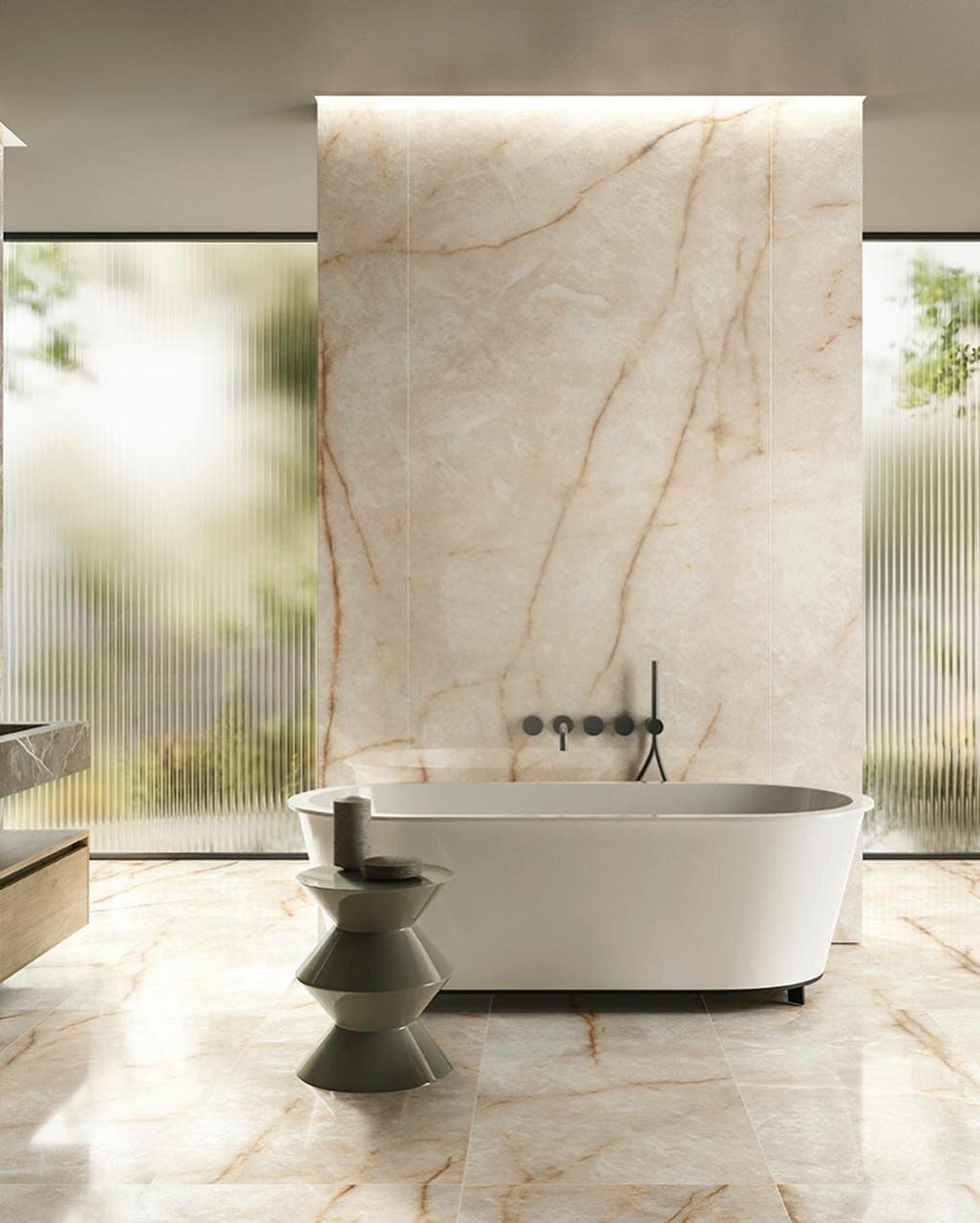 В коллекции обыгрываются элегантные породы мрамора и мраморной брекчии осадочного происхождения (Sahara Blanc, Oyster White и Breccia di Caravaggio), вулканический гранит с современной пескоструйной обработкой поверхности (Brazilian White, Brazili...
