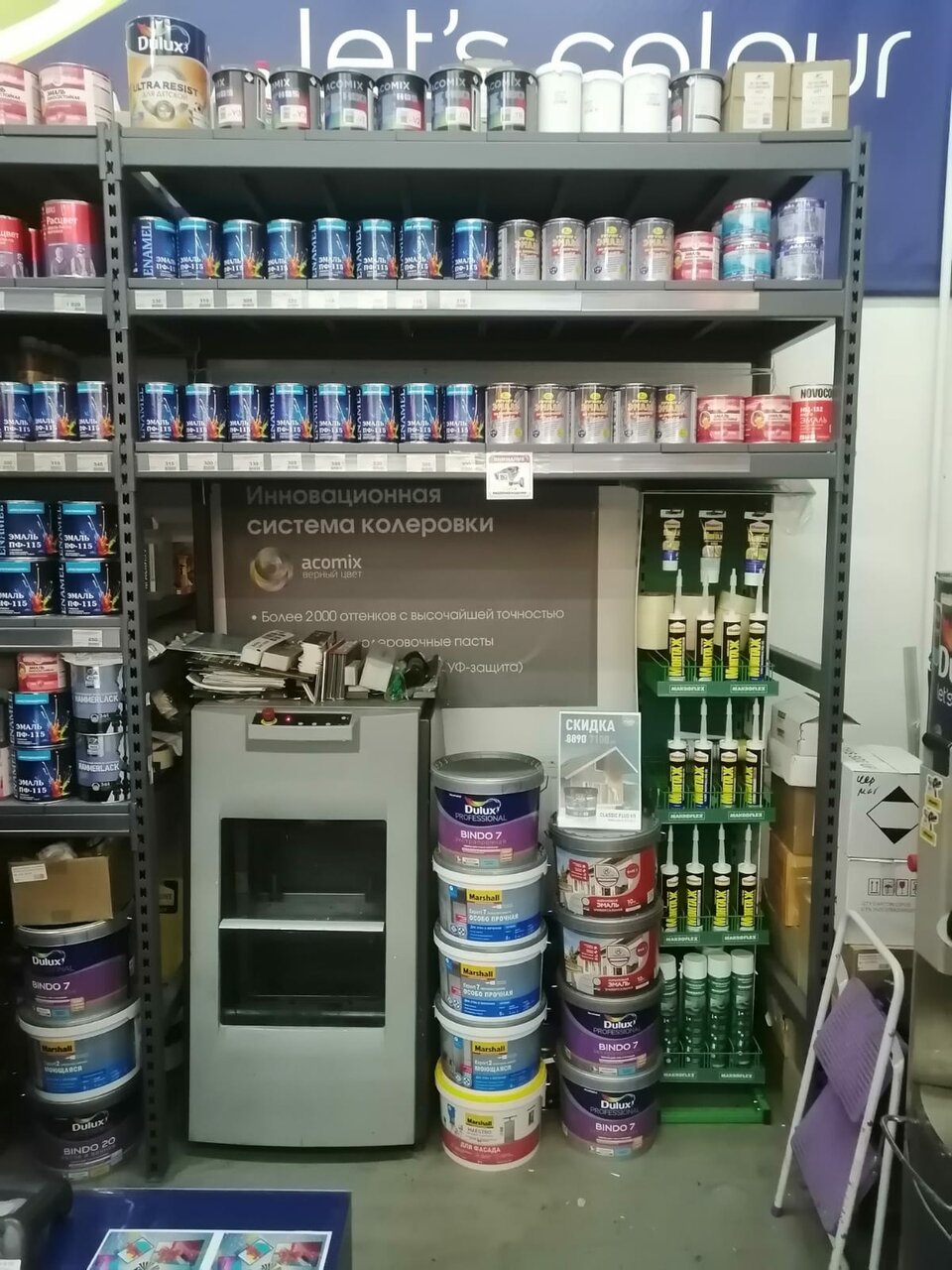 Магазин лаков и красок. Всё что полагается в нормальном магазине. Цены, как мне показалось, ниже средних — потому и воспользовался их услугами.
