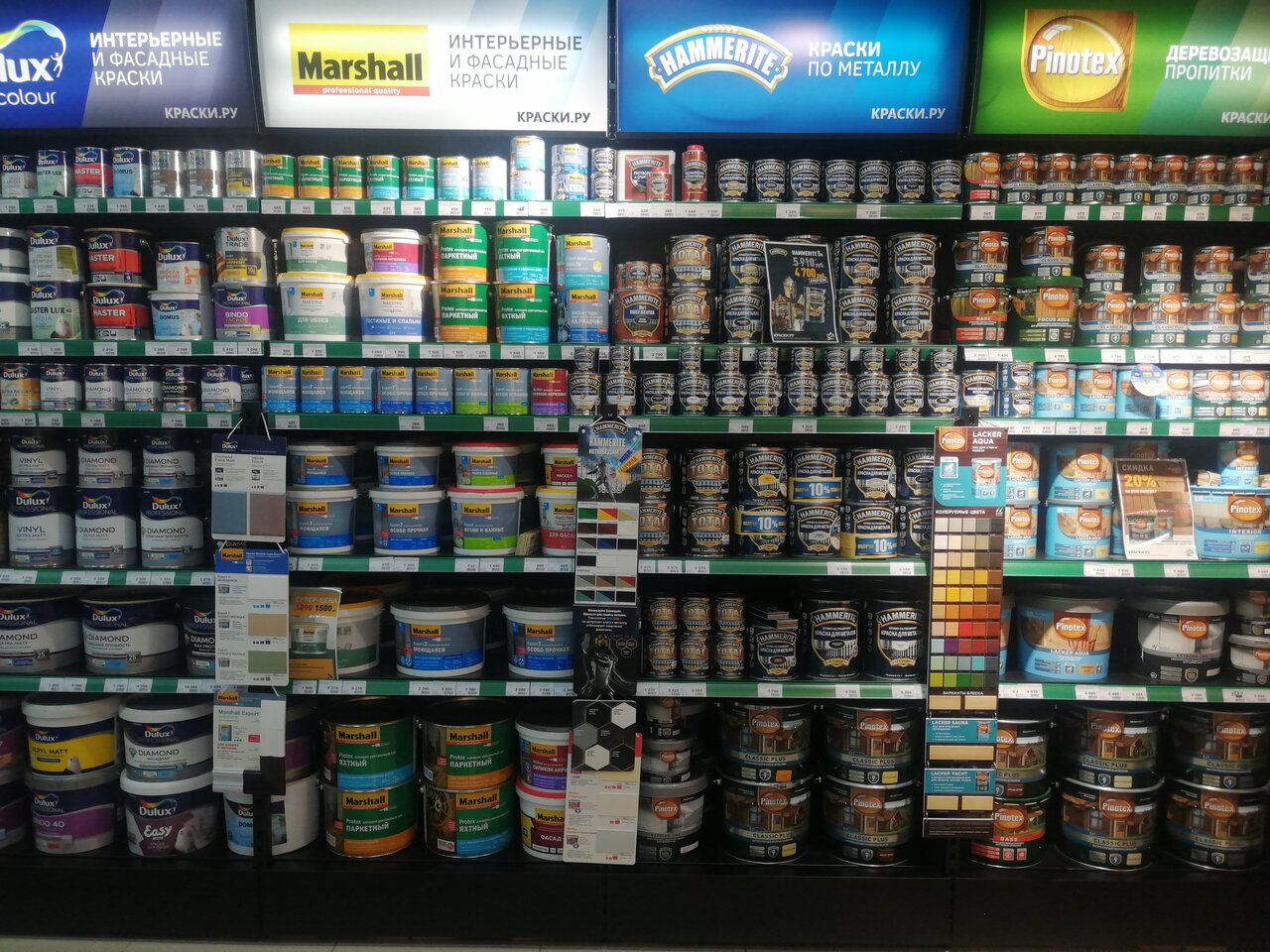 Много всяких материалов помимо красок. Брал клей для плитки, ребята на месте мне подобрали затирку(в цвет). Единственный минус запутаешься пока найдёшь, но так всё в Румянцево.