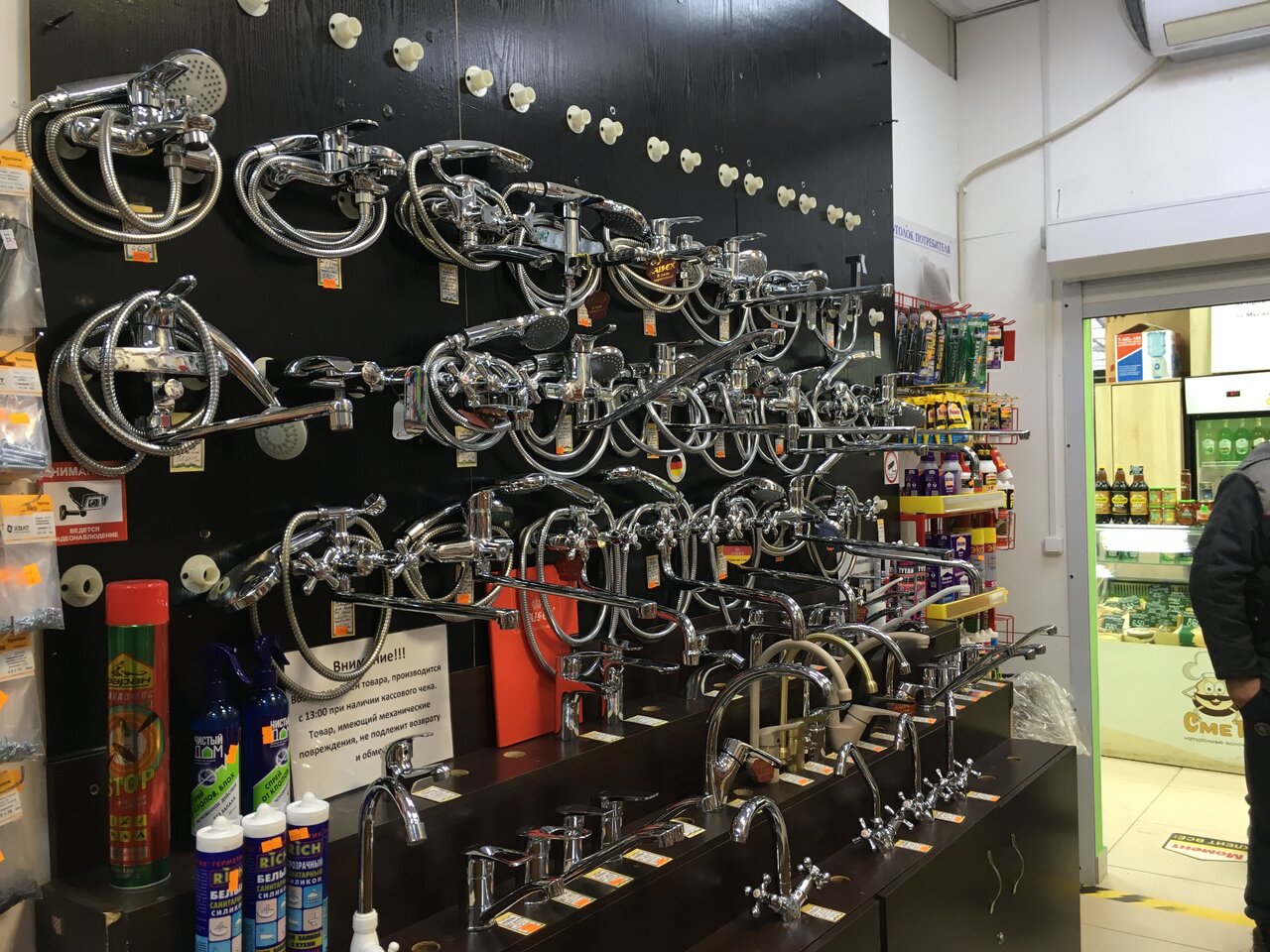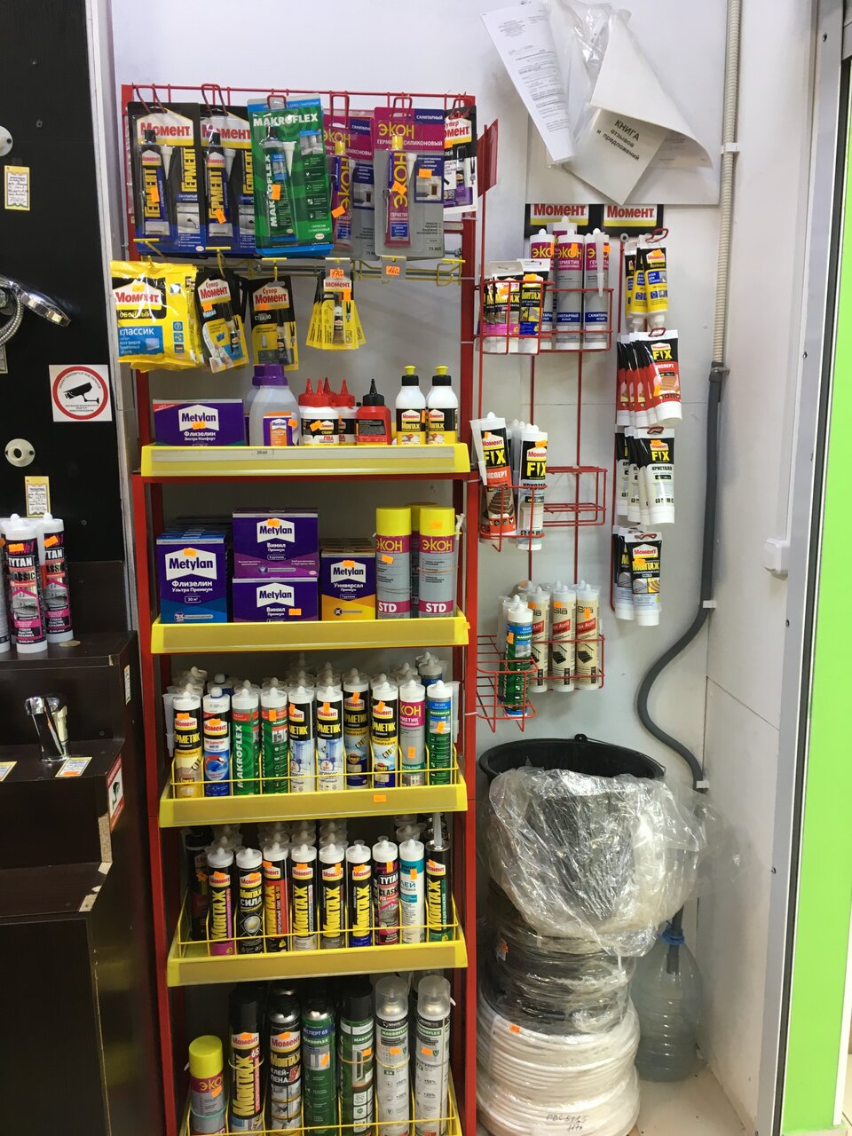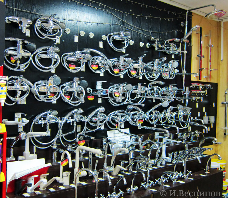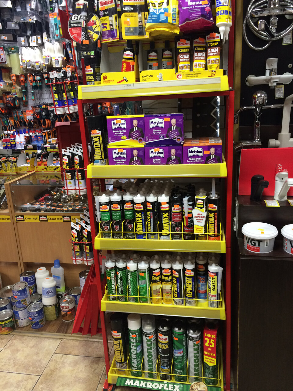 Непосвящённому покупателю может с первого взгляда показаться, что такие магазины все на одно лицо. Это бывает в тех случаях, когда их посещаешь в качестве зеваки. Однако, стоит только столкнуться в быту с конкретной проблемой, и сразу начинаешь понимать разницу. Вот, если у вас состарился смеситель в ванной, то вы поймёте, что далеко не в каждом магазине имеется хороший выбор. Здесь же вам предложат не один-два варианта, а десятки различных моделей — огромная стена выделена специально под такую витрину. А я для себя нашёл клей для стекла. Прежде и не знал, что такой существует, но оказалось, что на сегодняшний день за словом Момент скрывается умопомрачительный ассортимент — всё, что хочешь, можно склеить.
