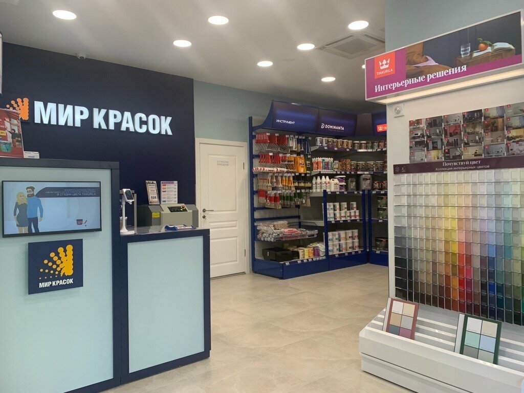 Наткнулся на магазин сети Мир красок на мичуринском проспекте. Магазин внутри компактный, все на глазах, инструменты, краски, выкрасы, раскладки, обои под покраску, паутинка, все в одном месте. Продавцы грамотно все подсказали, взял выкрасы для пробы цвета на стене.