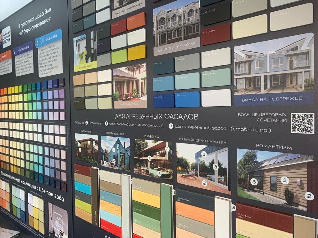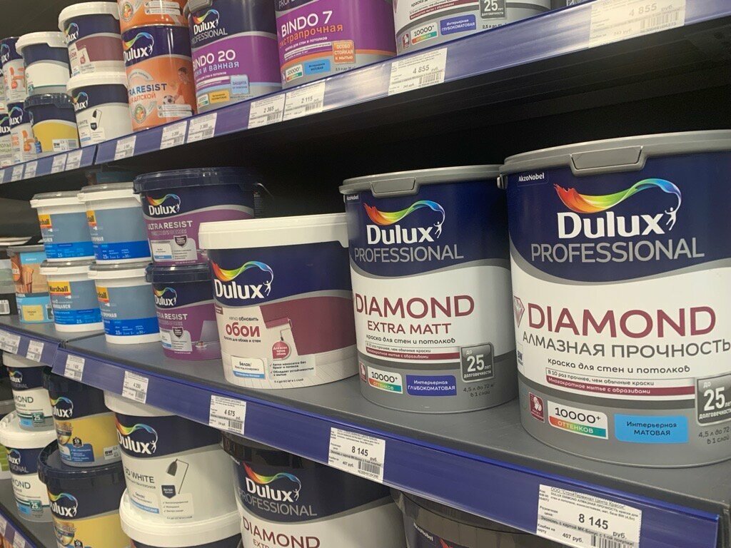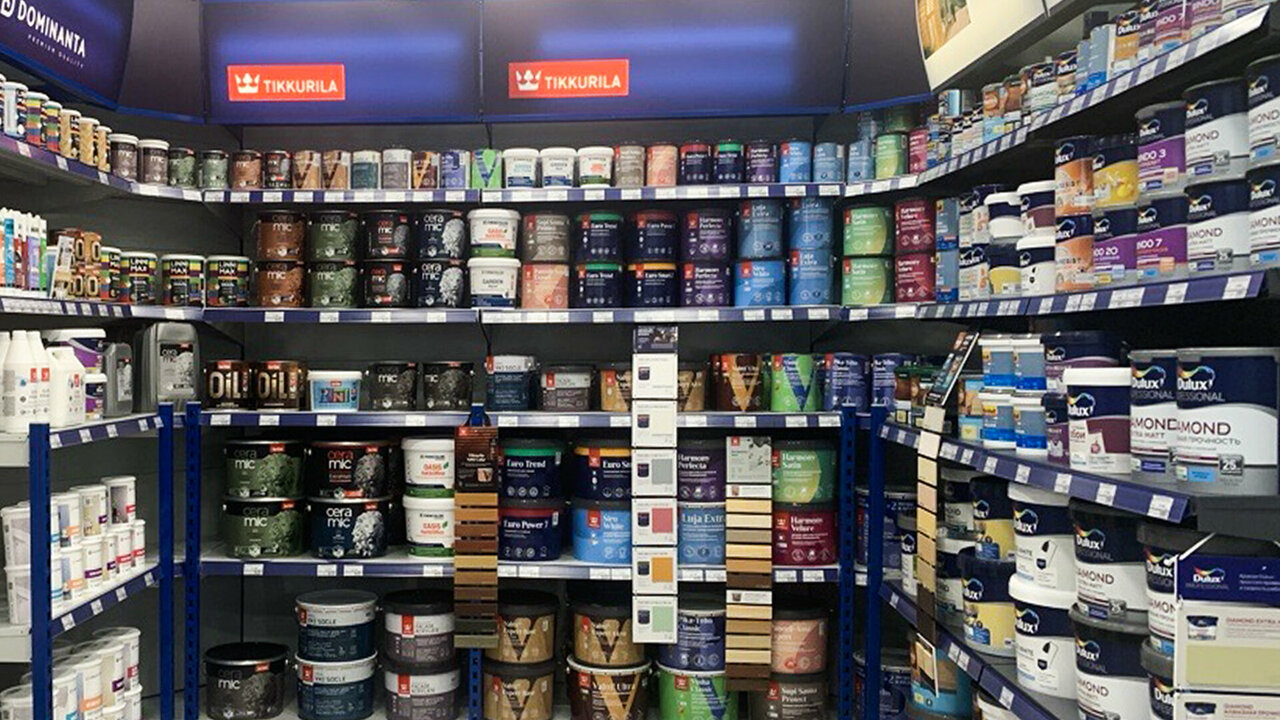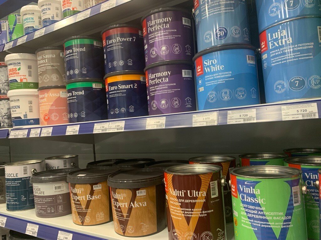 - Широкий ассортимент (краски, штукатурки, обои под покраску)