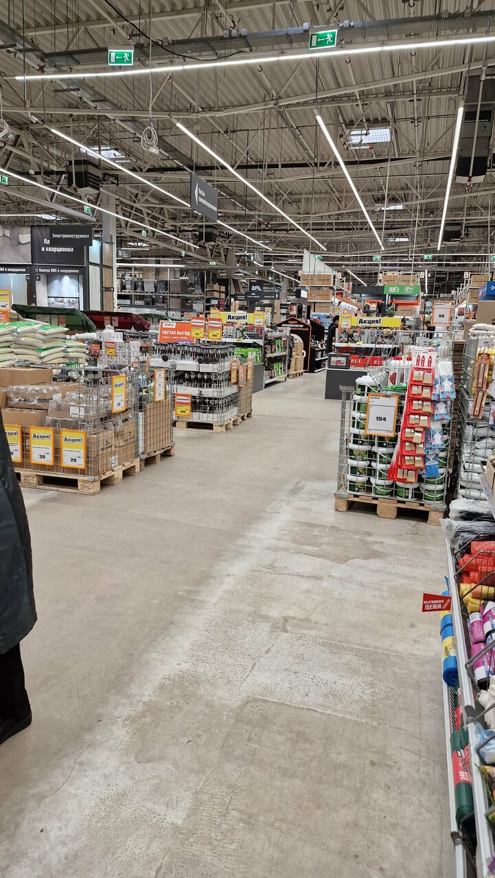 Удобный гипермаркет, большой выбор товара. Часто бывают скидки. Цены конечно не идеал, но лучше все купить в теплом гипермаркете, чем носится по строительным рынкам. Половина материалов на дом закупались тут, все четко. Рассады, цветочки, все выжило. Бал снимаю за наглую крысу бегавшую в отделе удобрений. Напугала, чертовка