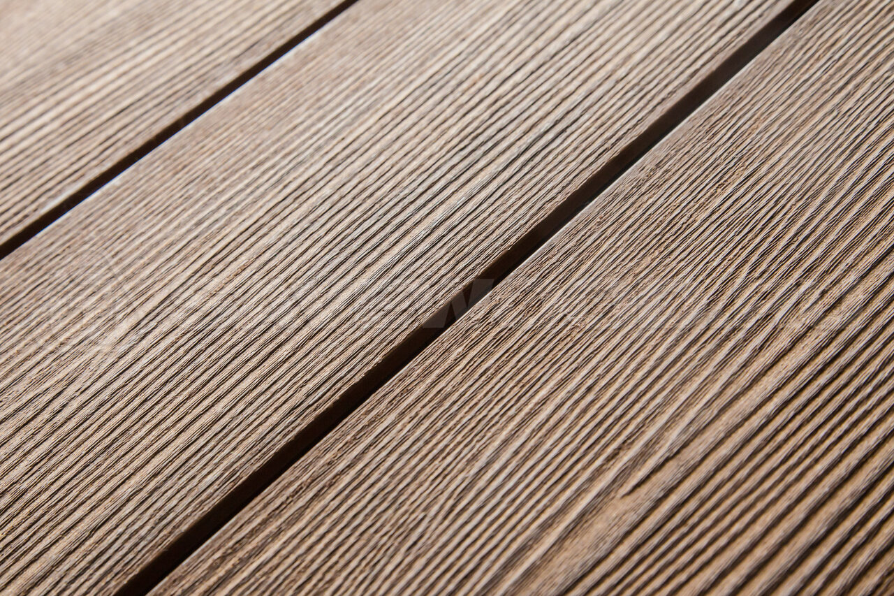 Террасная доска ДПК на основе ПВХ. Размеры 146х22 мм. С одной стороны профиля текстура дерева, с обратной стороны — текстура вельвет. Подходит как для дома и дачи, так и для коммерческих проектов и больших террас.Длина доски 3 м, 4 м или 6 м.