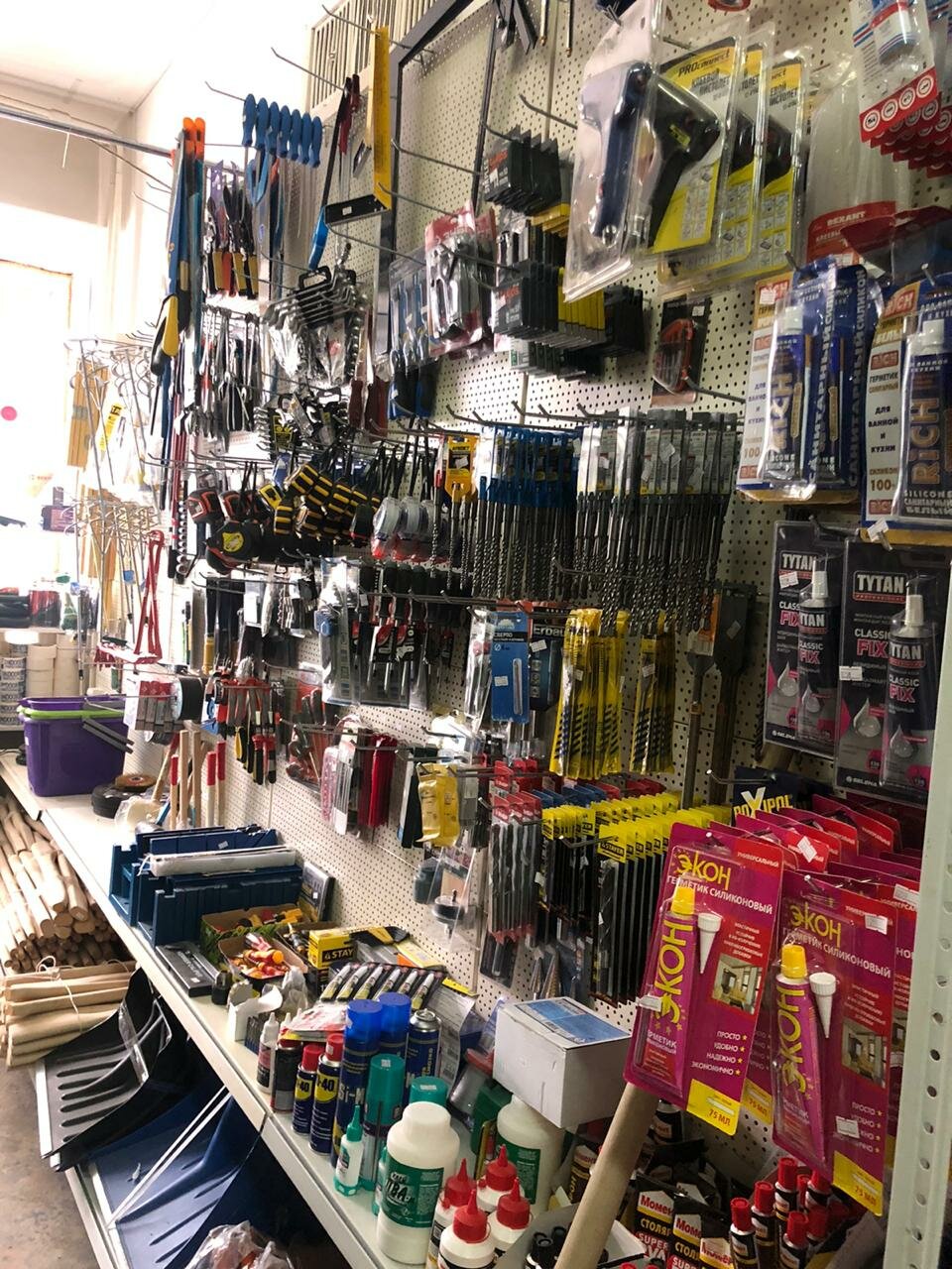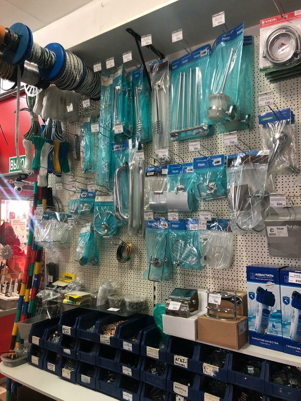 Для мелкого ремонта можно найти необходимое. Брали как-то кран, нормальный, работает. Винтики, отвёртки, метры, плёнка, шланги и всякое прочее.