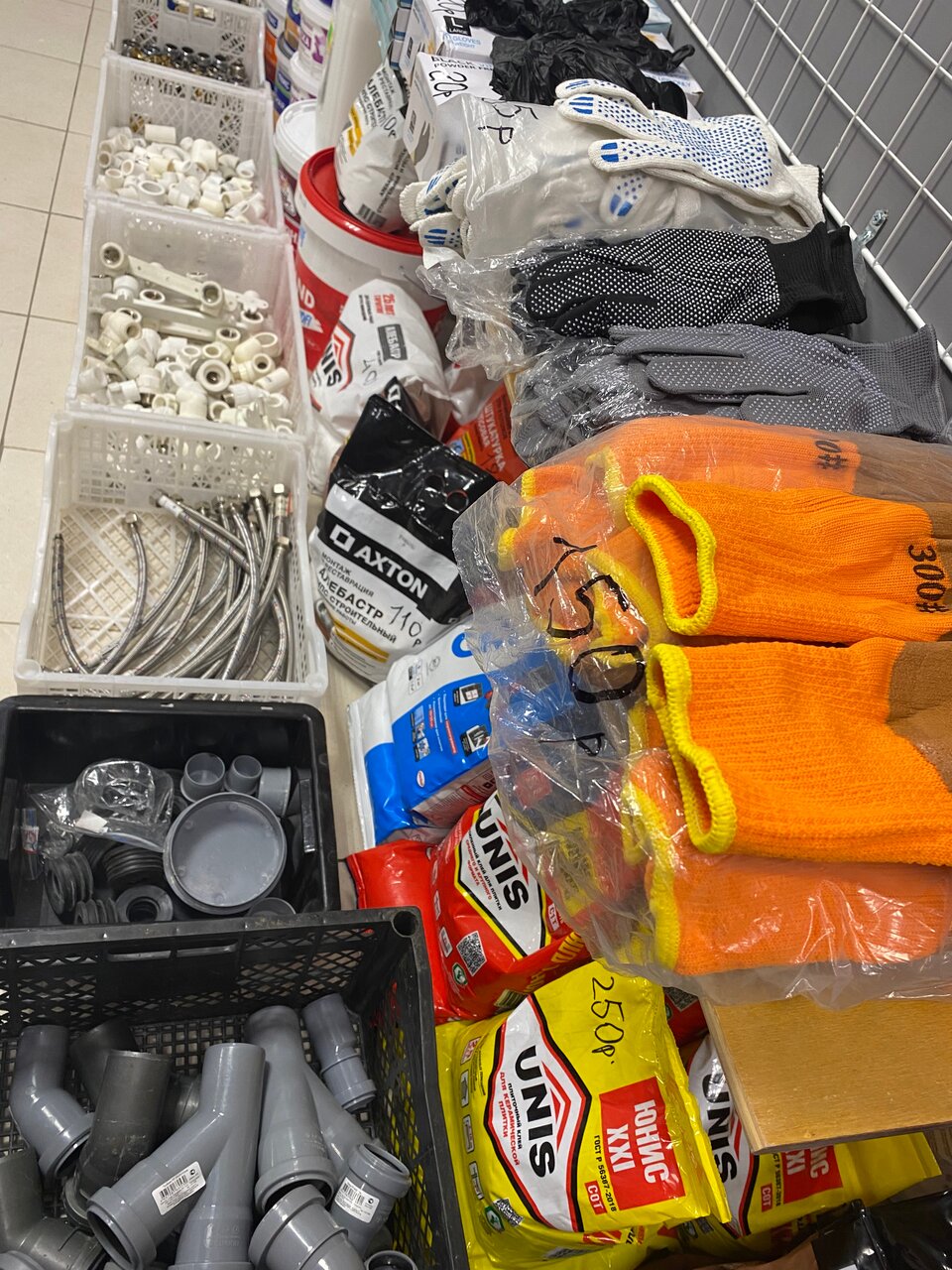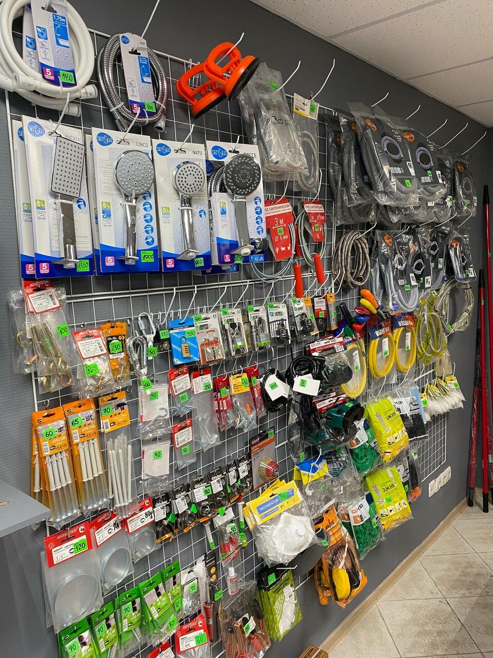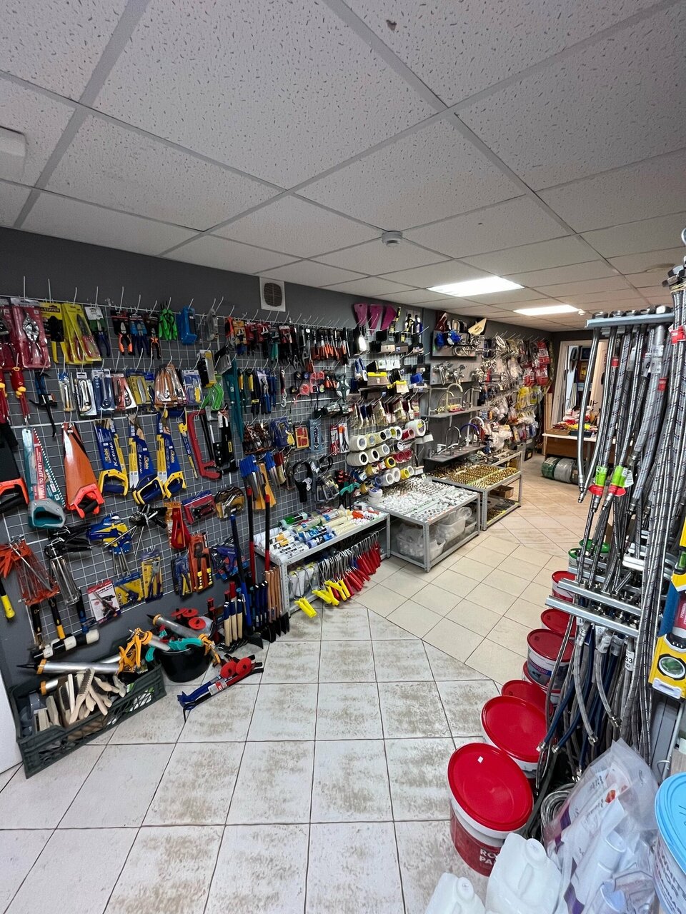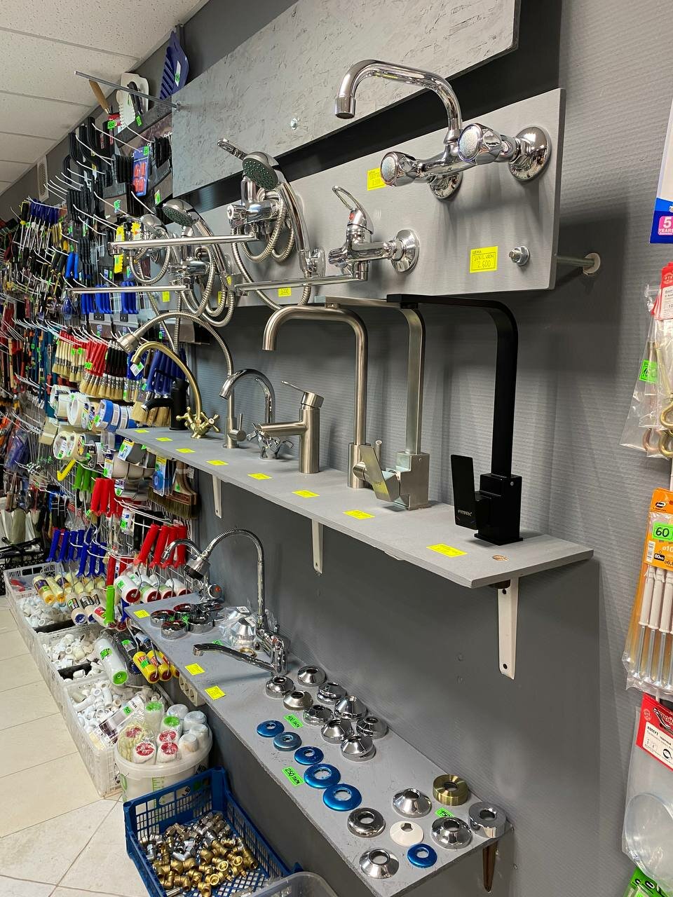- Широкий выбор для разных видов работ (сантехника, электрика, инструменты и т. д.)