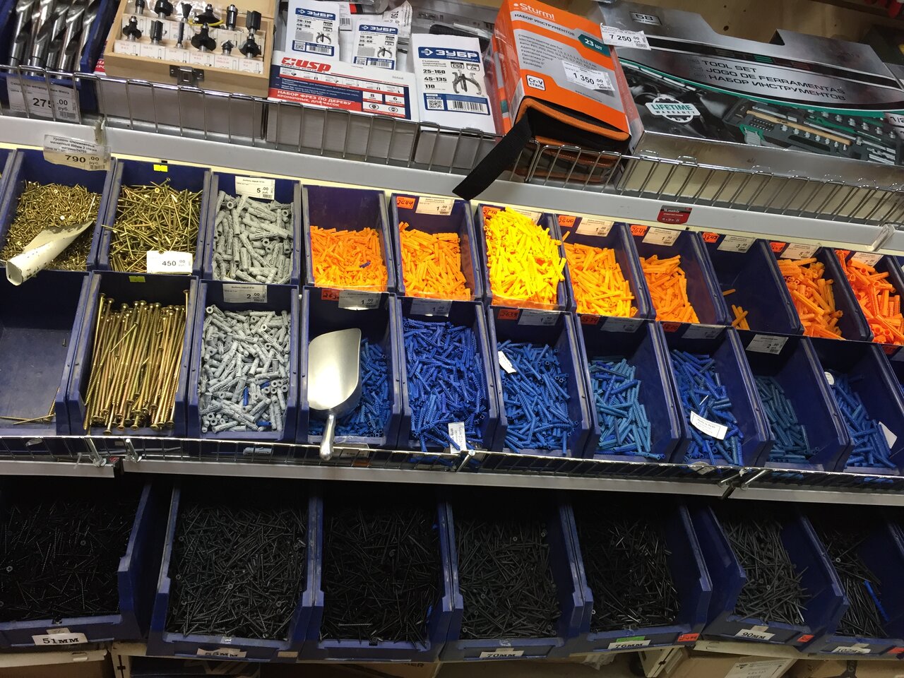 Магазин хорош тем, что в нем есть саморезы и дюбели (разные). Но в нём нет лампочек.