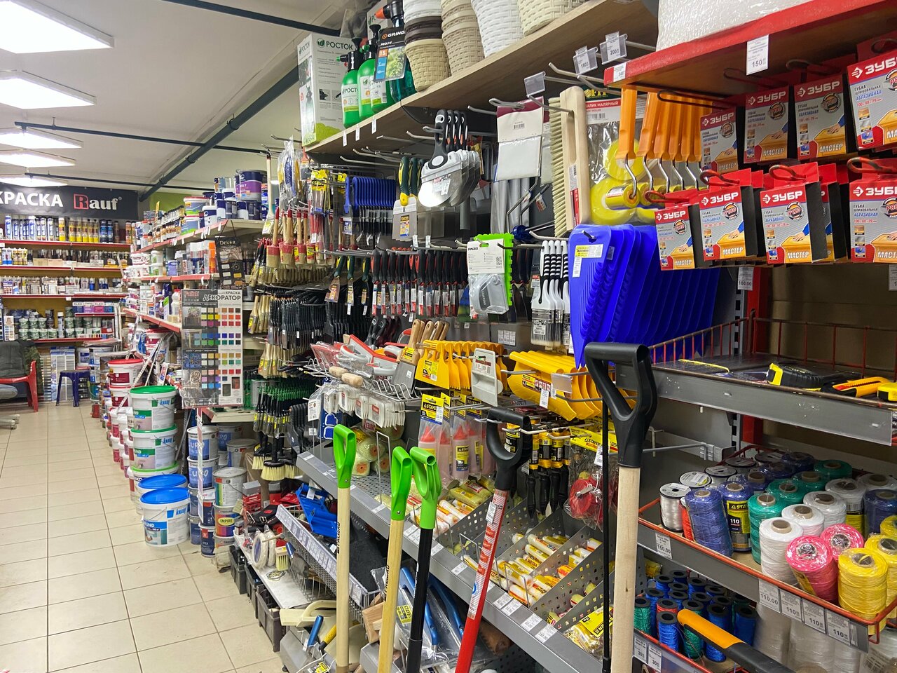 Большой ассортимент хоз товаров.Для квартирного ремонта есть практически всё,за исключением цеменьа и кирпичей.