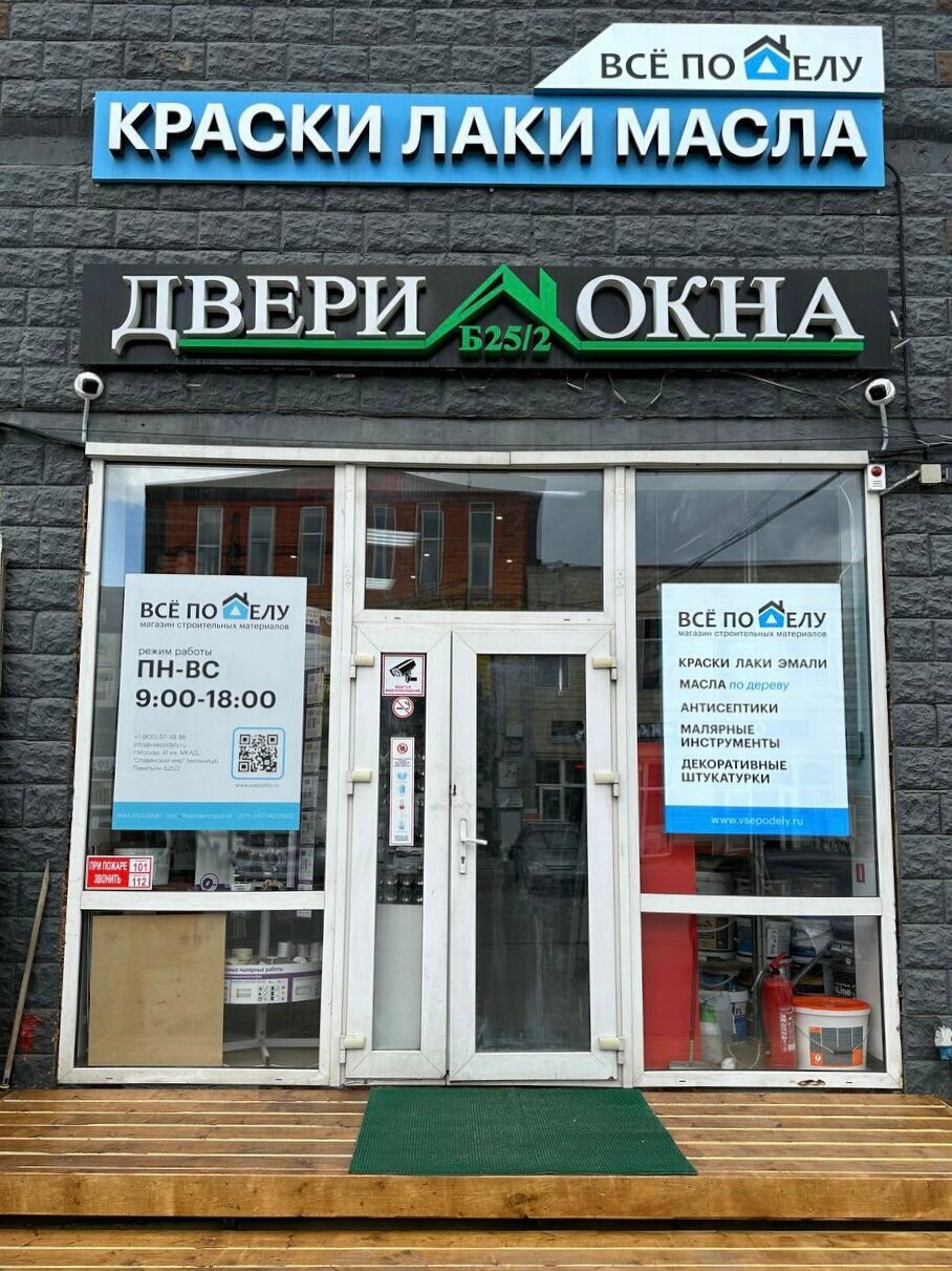 «Всё по Делу» – строительный магазин в Москве, расположенный по адресу: МКАД, 41-й километр, 4, стр. 14. Специализируется на продаже строительных материалов, инструментов и товаров для ремонта, включая услугу колеровки. Режим работы: пн-пт 08:00–18:00, сб-вс 09:00–18:00. Контакты: сайт (https://vsepodely.ru/), телефон 8 (800) 511-48-86.