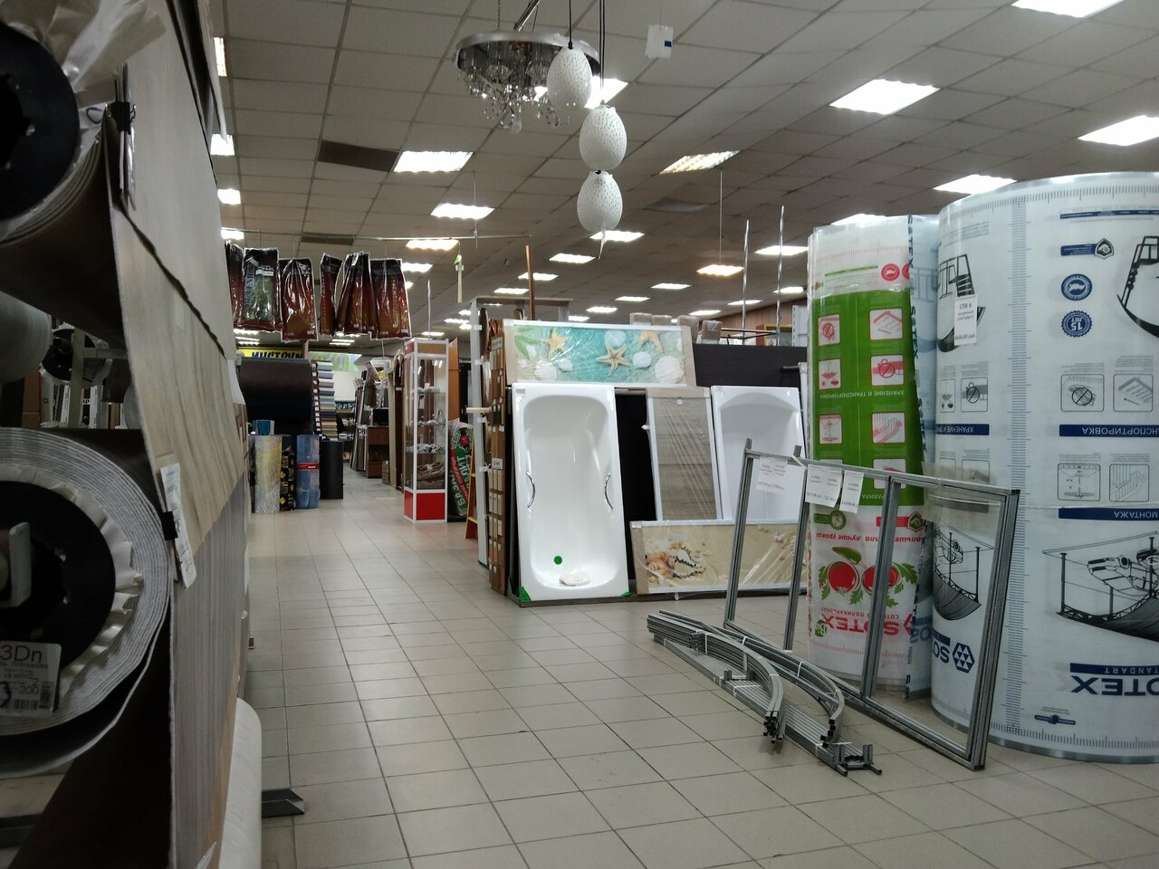 Это мой любимый магазин, есть всё для ремонта, самый большой выбор плитки, ленолиума, обои хорошие, инструменты, по электрике хороший выбор, по красителям, побелочные средства, люстры, сантехниха, всё там покупаем для дома,для бани, коврики различные, двери- большой выбор, сразу чуствуеться что есть ответственный хозяин, пять баллов