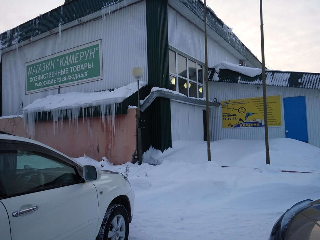 Строительный магазин «Камерун» находится в Нижневартовске по адресу: ул. Индустриальная, 85, стр. 15. Предлагает широкий ассортимент строительных материалов, инструментов и товаров для ремонта. Режим работы: пн-сб 08:00–19:00, вс 08:00–18:00. Контакты: +7 (3466) 24-88-48 (офис), +7 (3466) 49-12-47.
