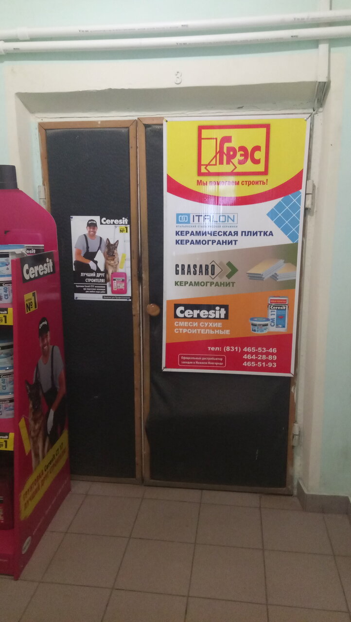 Грес — строительный магазин в Нижнем Новгороде, предлагающий материалы, инструменты и товары для строительства, ремонта и отделки. Расположен по адресу: проспект Гагарина, 23А. Режим работы: пн-пт 08:30–17:00. Контакты: +7 (831) 465-51-93, +7 (831) 465-53-46, +7 (831) 464-28-89. Подробнее на сайте: (http://keramik-gres.ru/).