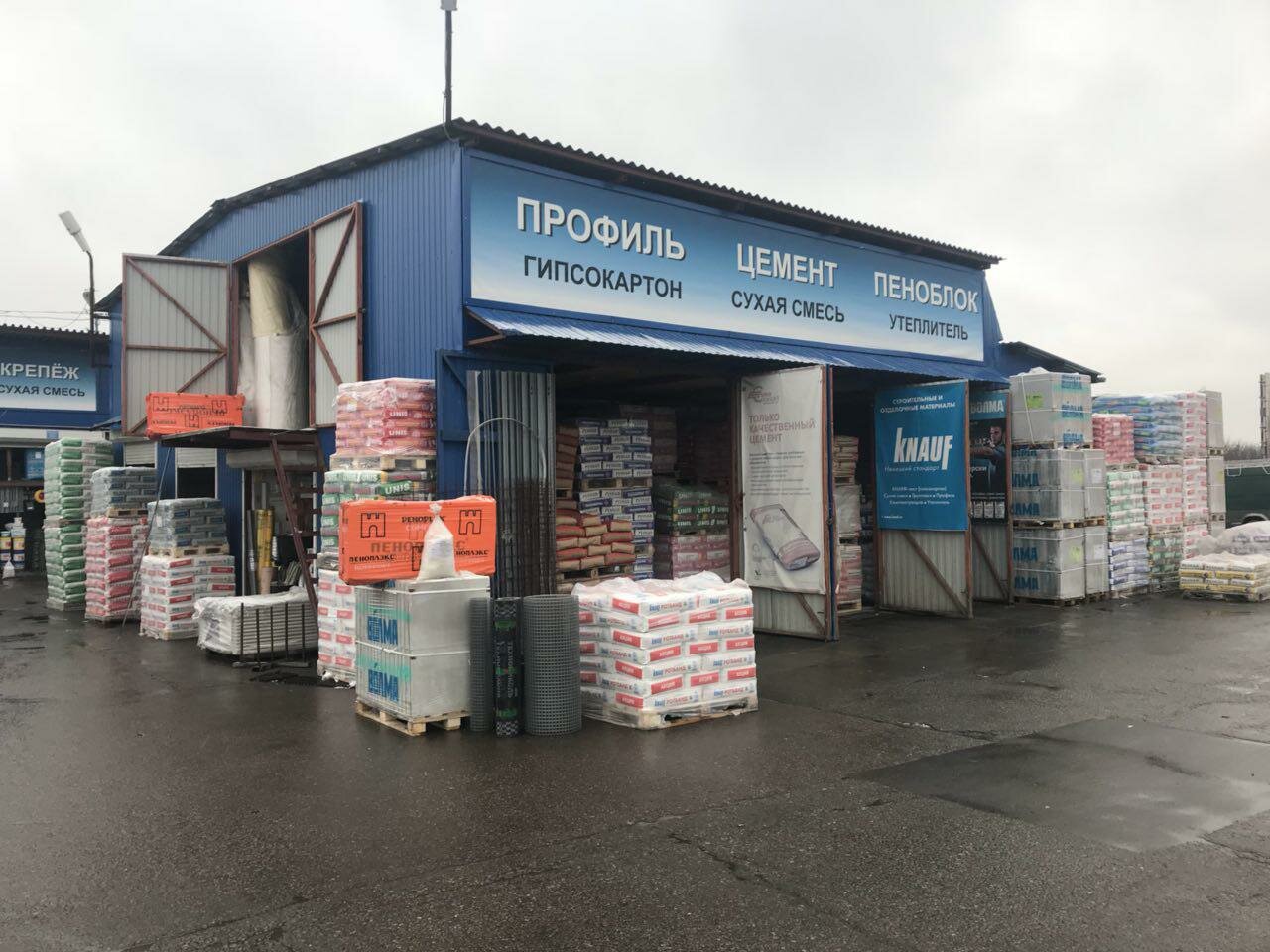 - Достаточный ассортимент (строительные мешки, пена, саморезы и др.).