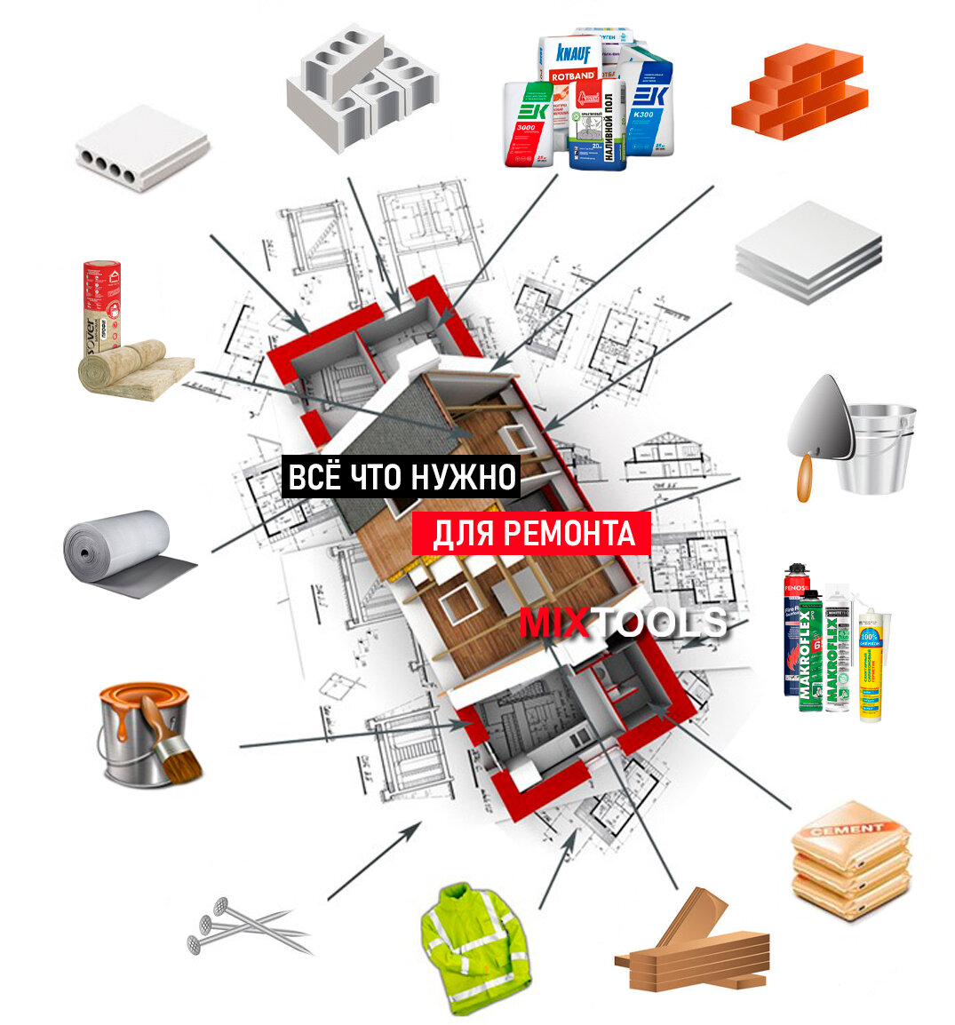 Строительные смеси, строительный магазин, строительный инструмент