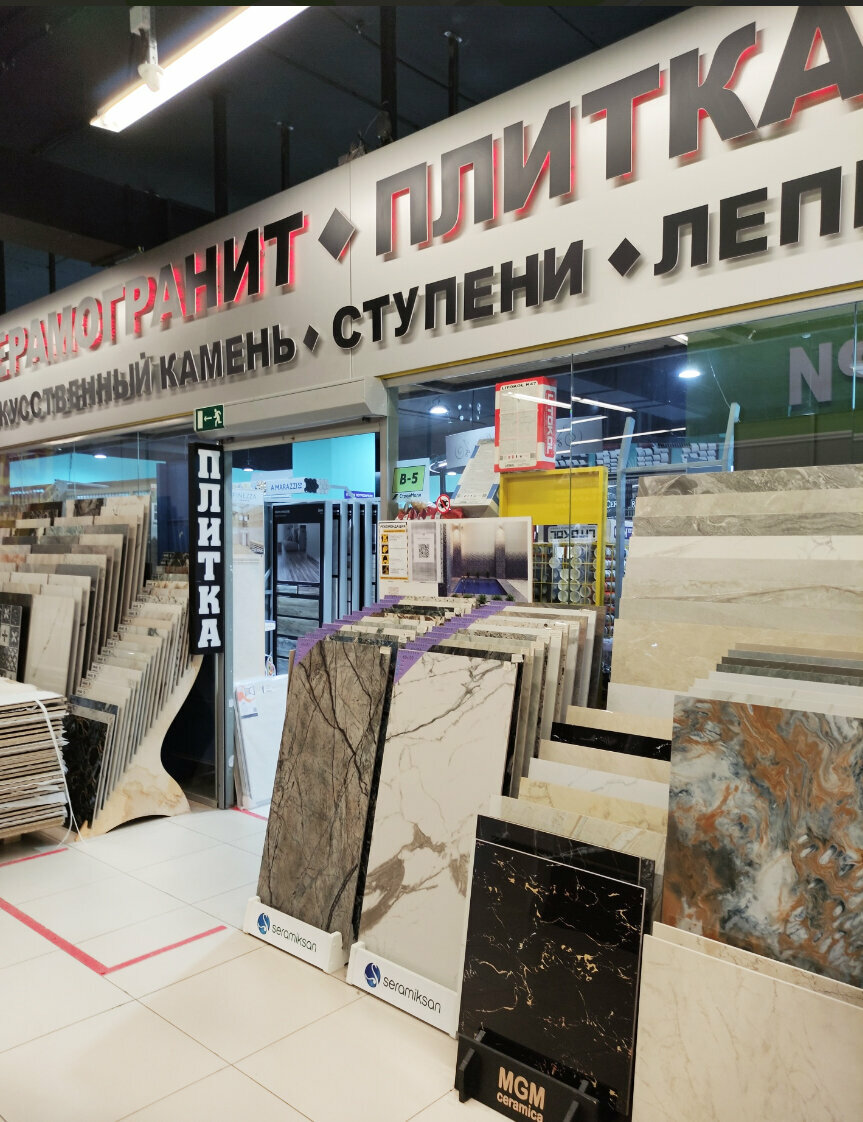 Покупал тут плитку для кухни. Выбор большой, но надо все проверять, часть была битая, пришлось ехать докупать