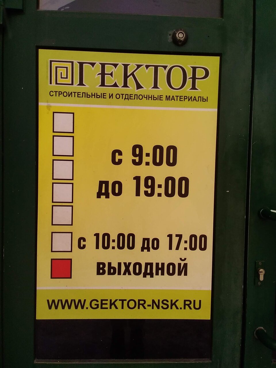 Гектор — строительный магазин в Новосибирске, расположенный по адресу: ул. Ватутина, 7. Ассортимент включает материалы, инструменты и товары для строительства, ремонта и отделки. Режим работы: пн-пт с 09:00 до 18:00. Контакты: +7 (383) 308-10-09, сайт: (https://gektor-nsk.ru/).