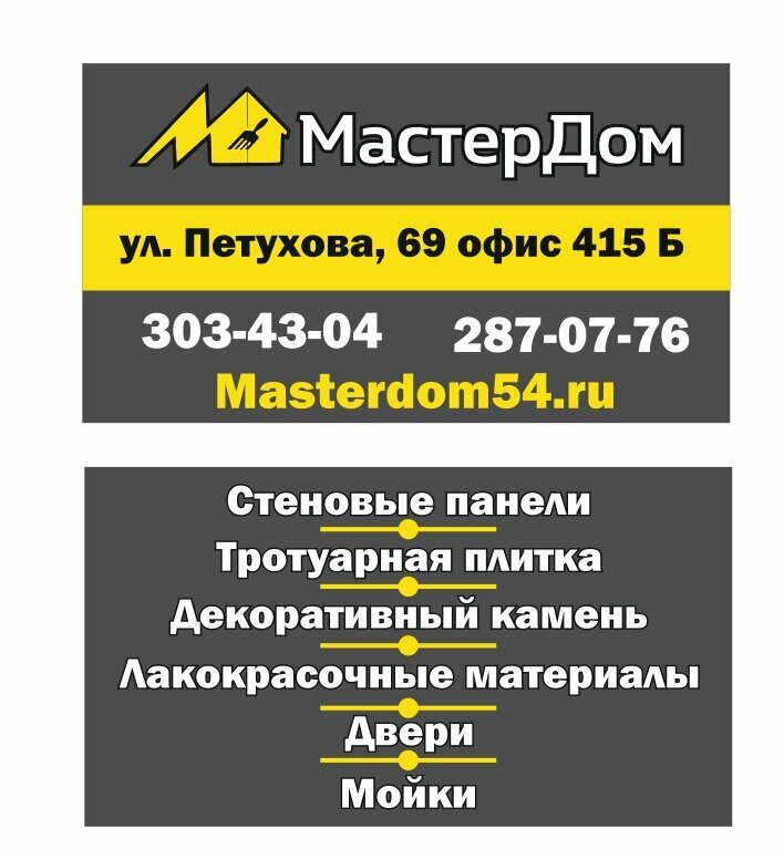 📍 Адрес: ул. Петухова, 69 🕒 Режим работы: Пн–Пт: 10:00–20:00 Сб: 10:00–18:00 📞 Телефон: +7 (383) 303-43-04 (Торговый зал) 🌐 Сайт: (http://masterdom54.ru/)