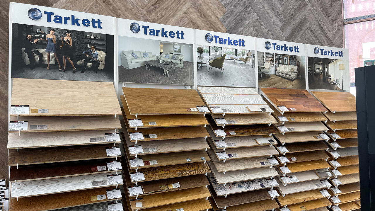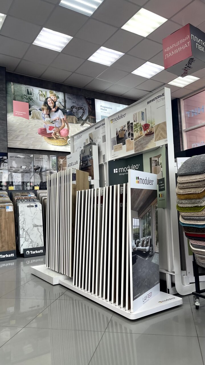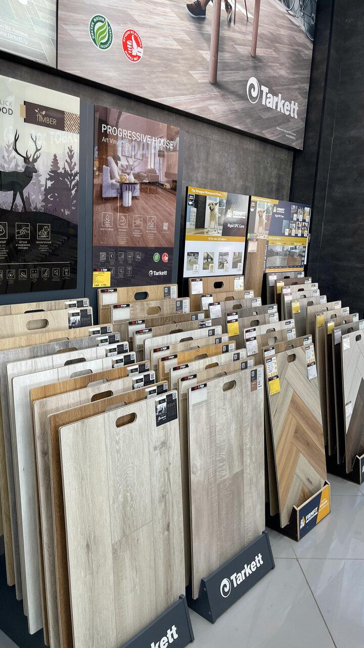 Хороший выбор Таркетт, все виды покрытий. Консультация очень средняя, большие объёмы под заказ, в наличии нет. Нет расширенного возврата: не успел положить плитку за 2 недели — вернуть не сможешь.