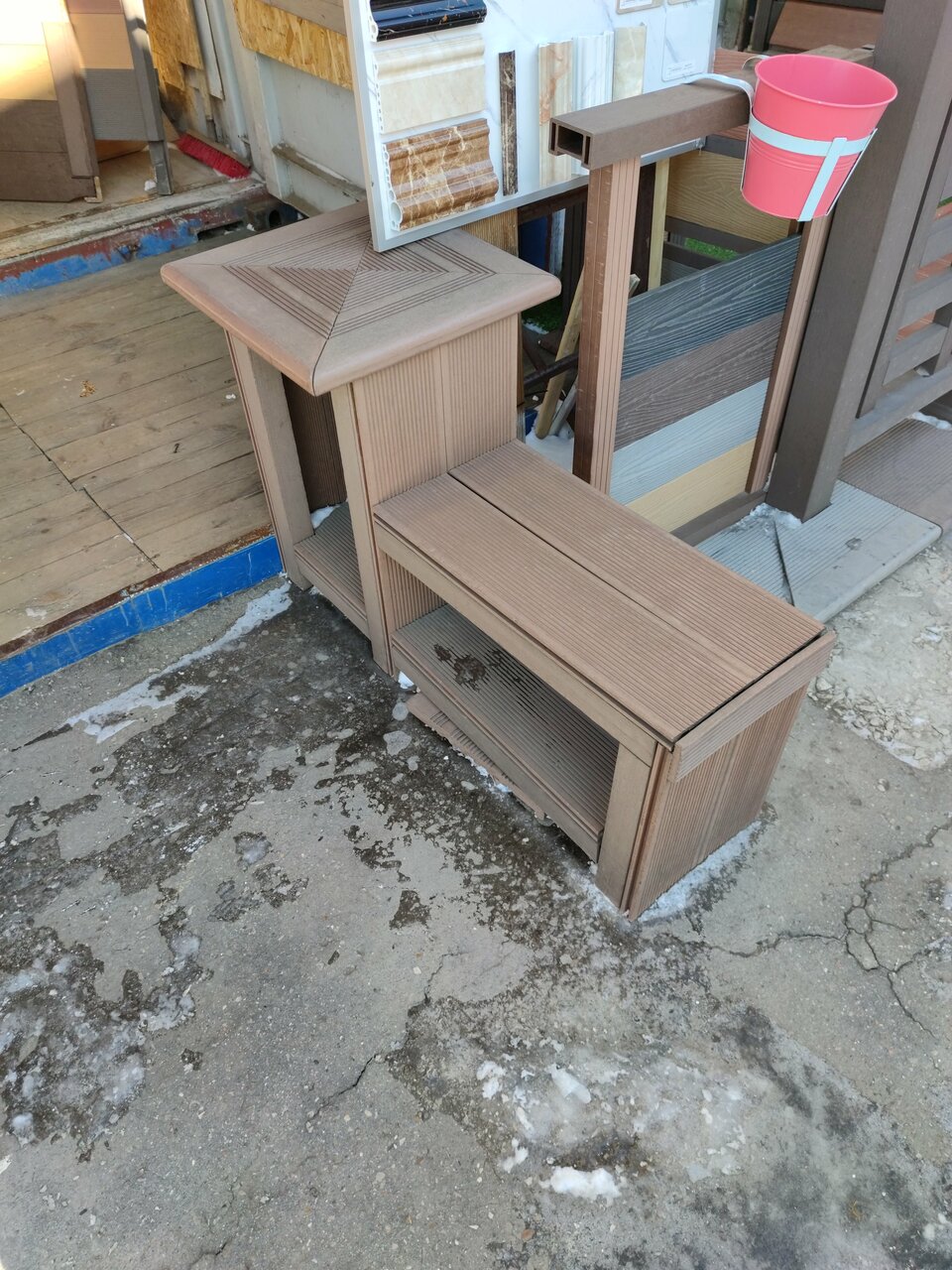 Широкий ассортимент продукции из древесно полимерного композита ( террасная доска, грядки, фасадные панели, ограждения) пластиковая садовая мебель. Можно приобрести из наличия или привезут под заказ. Рекомендую !