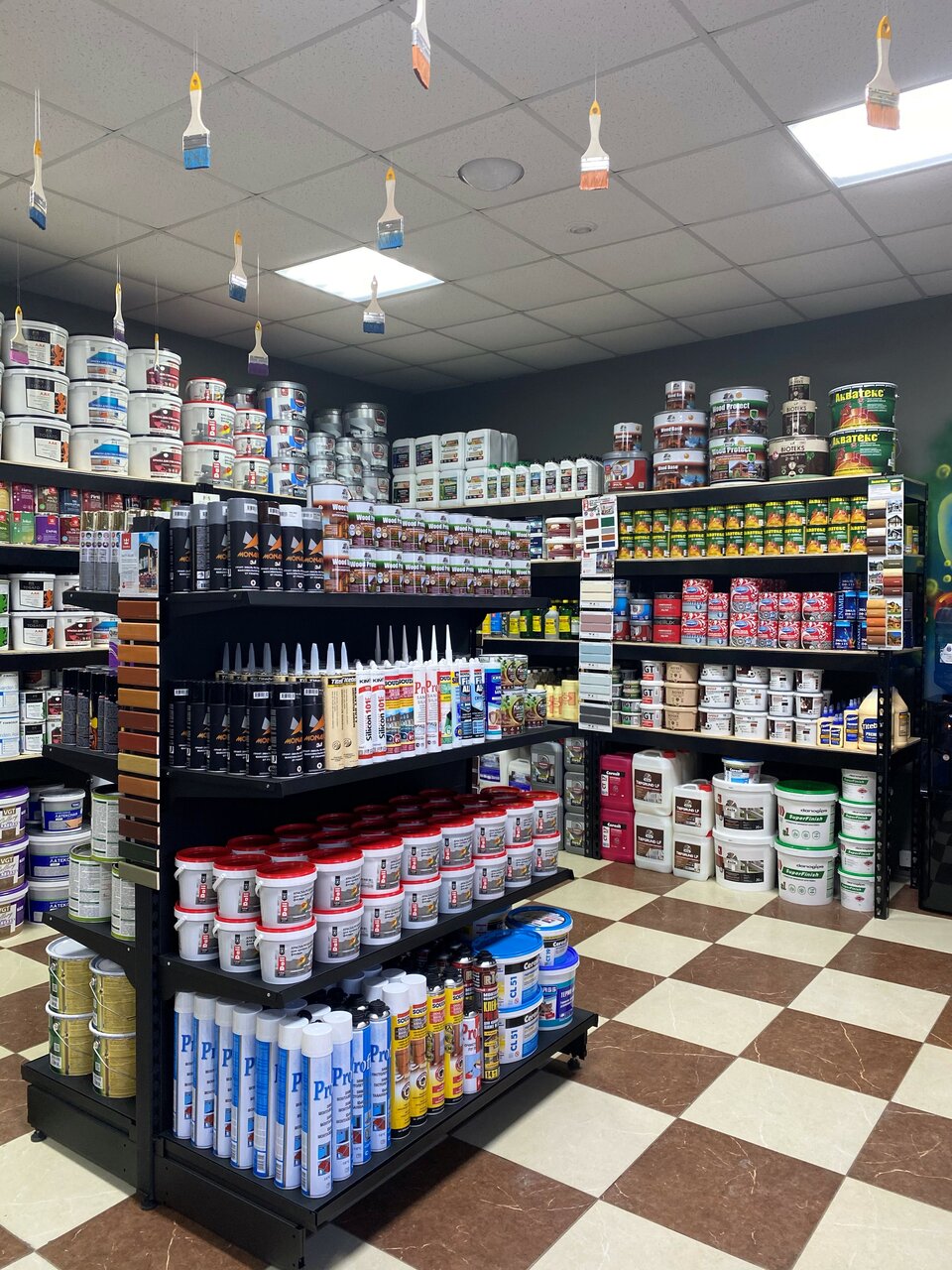 - Хороший ассортимент товаров (двери, краски, напольные покрытия, плитка и др.)