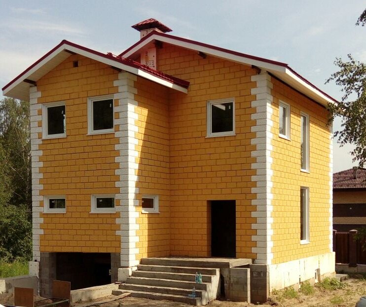 - Экономия на декоре фасадов (можно просто покрасить); Не требует утепления; Быстрое строительство (пример поселка Светлый).; Дом перезимовал нормально (газ, тёплые полы, радиаторы); Производитель предоставил скидку на доставку