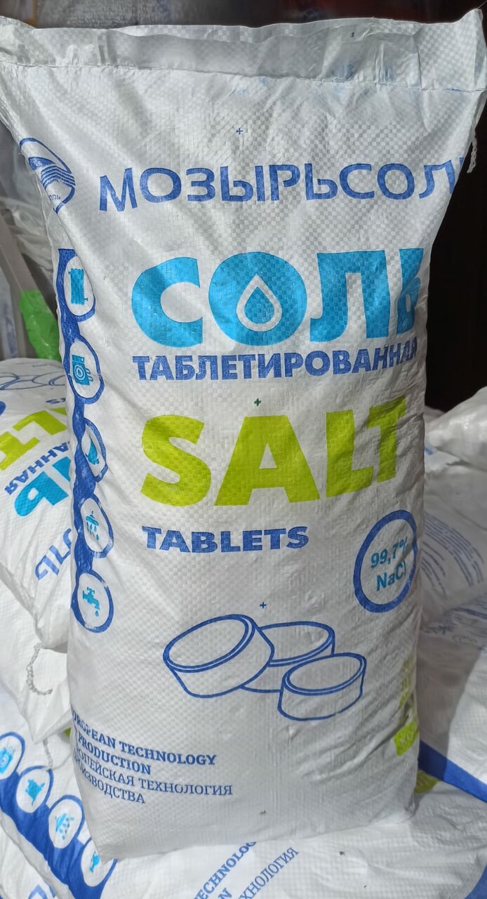 Соль таблетированная 'Мозырьсоль' из сырья «Экстра» - 1000 руб./25 кг мешок- для восстановления ионообменных cмoл водоумягчительных установок, применяемых в процессе подготовки и умягчения воды для пищевых, фармацевтических и иных прозводств, в п...
