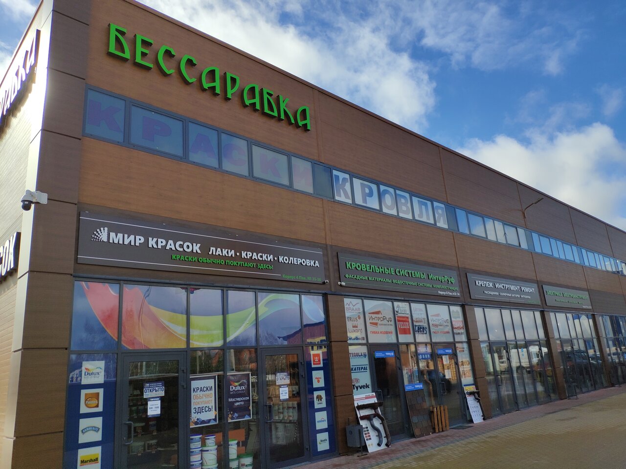 - Широкий ассортимент (стройматериалы, инструменты, краски, плитка и др.)