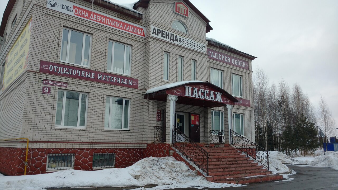 Адрес: ул. Менделеева, 9 Режим работы: Пн–Пт: 09:00–19:00 Сб: 09:00–18:00 Вс: 09:00–16:00 Телефон: +7 (910) 962-74-26 Сайт: (https://passazh-ulitsa-mendeleeva.clients.site/)