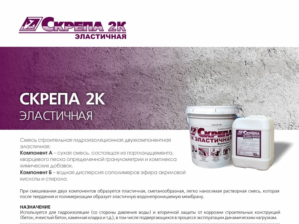 Применяется для ремонта и гидроизоляции железобетонных, кирпичных и каменных конструкций