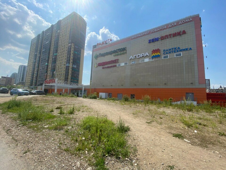 Большой строительный торговый центр, есть продуктовый Перекресток, чисто уютно