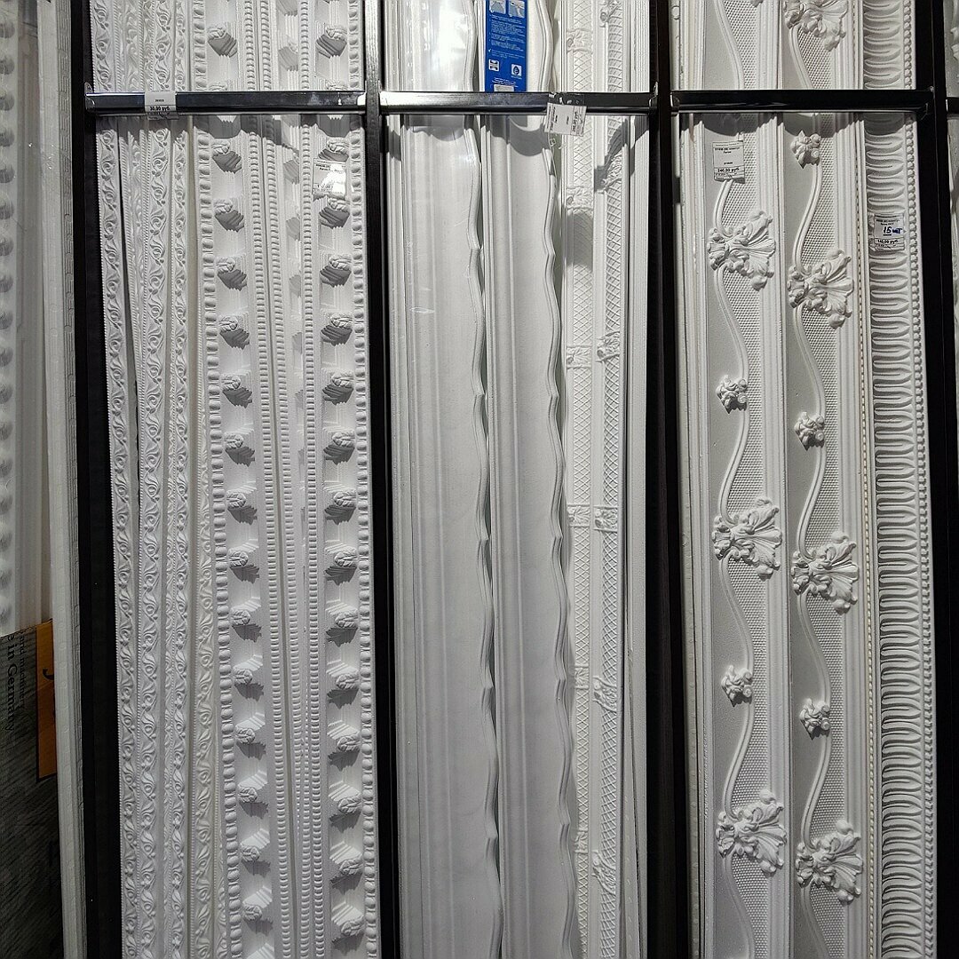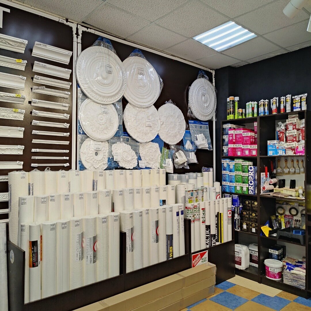 - Обширный выбор обоев, клея, галтелей