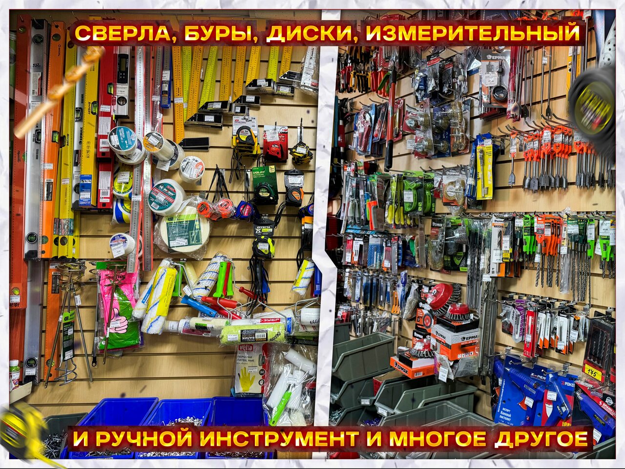 - Широкий выбор товаров (от молотка до пилы).