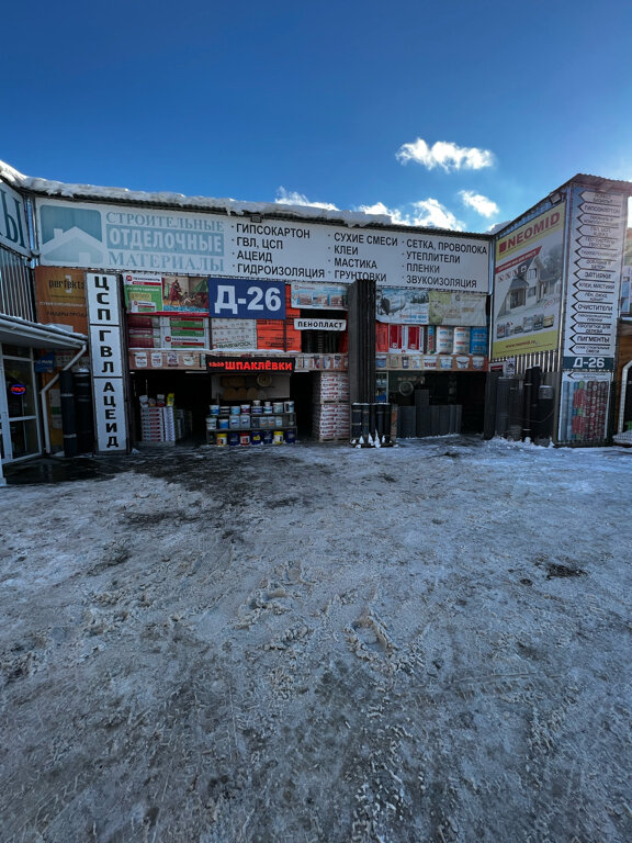 Д-26 – строительный магазин в Раменском (Московская область, квартал 20262), предлагающий материалы для строительства и отделки. В ассортименте: стеновые панели, газобетон и сопутствующие товары. Режим работы: ежедневно с 08:00 до 18:00. Контактный телефон: +7 (916) 533-83-33 (менеджер).