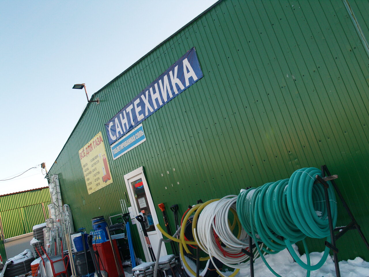 Ничего толкового нет — небольшие магазинчики со строительной мелочевкой, но ничего полезного не нашли. Искали трубы металлические — в наличии одни ржавые, которым пора на свалку.