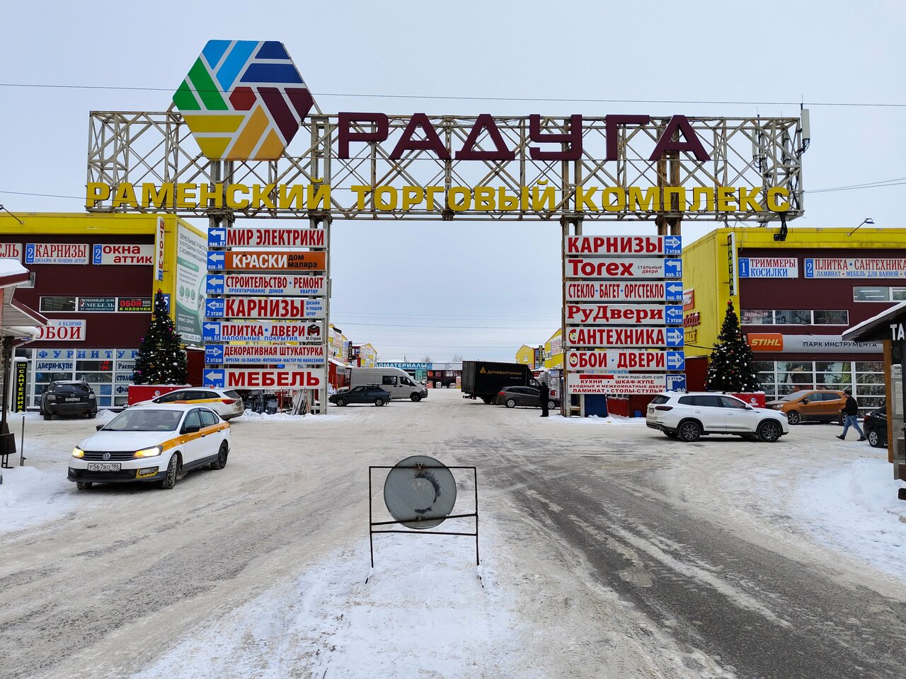 Есть всё, Парковка удобна, все, практически все торговые площади доступны на автомобиле (в шаговой доступности). Небольшое пожелание к администрации — организовать одностороннее движение по ‘улицам’ Радуги .