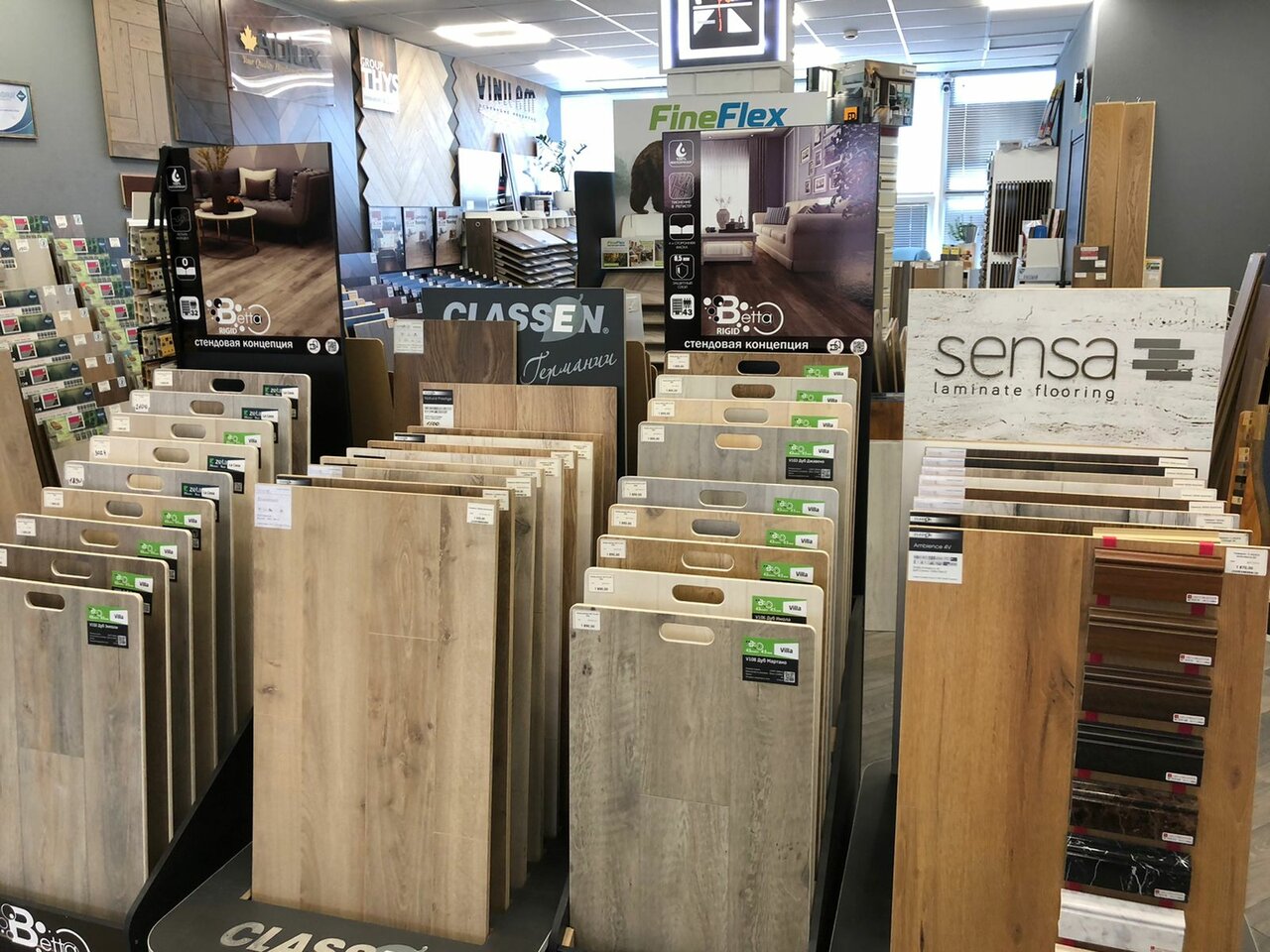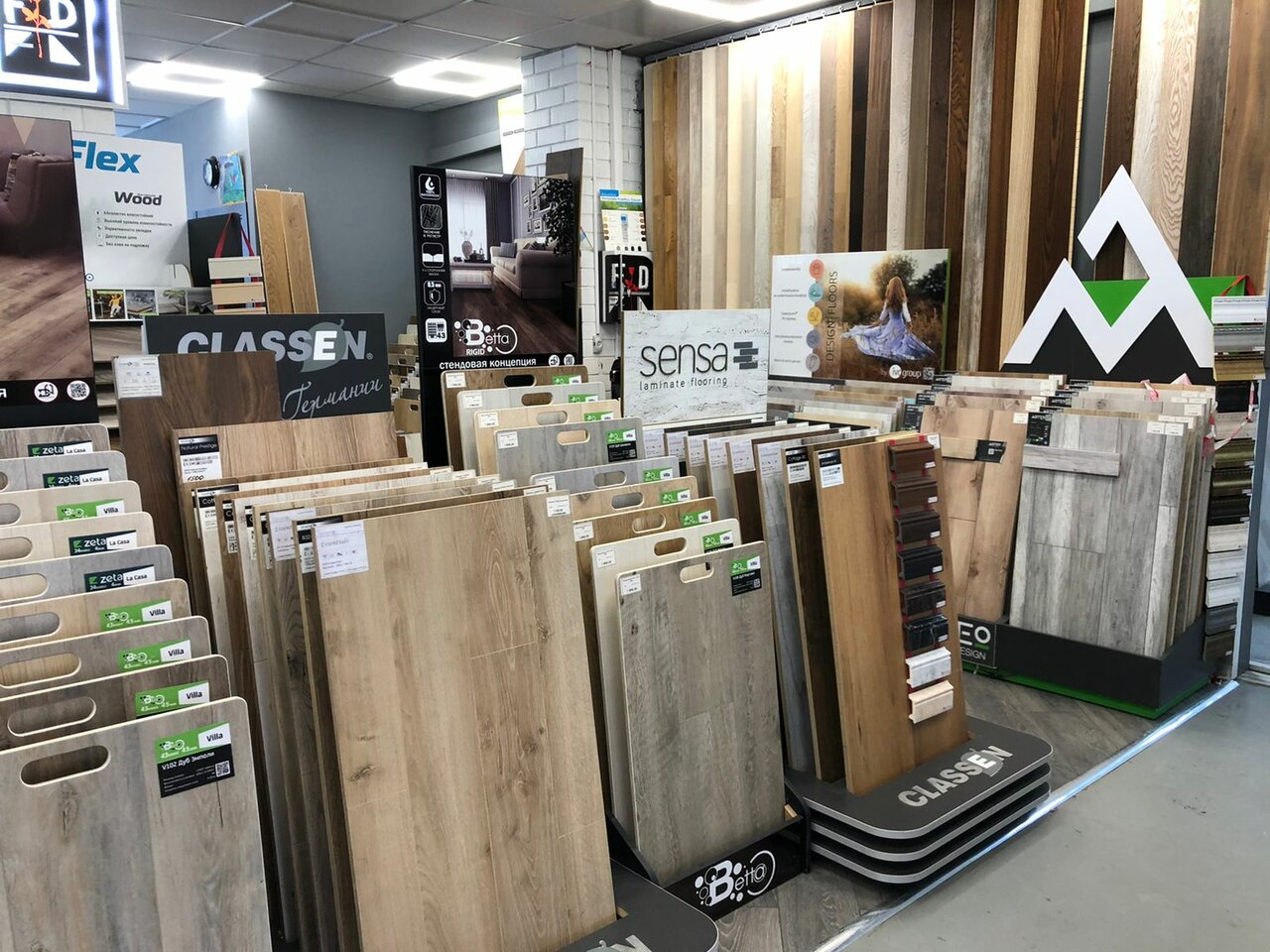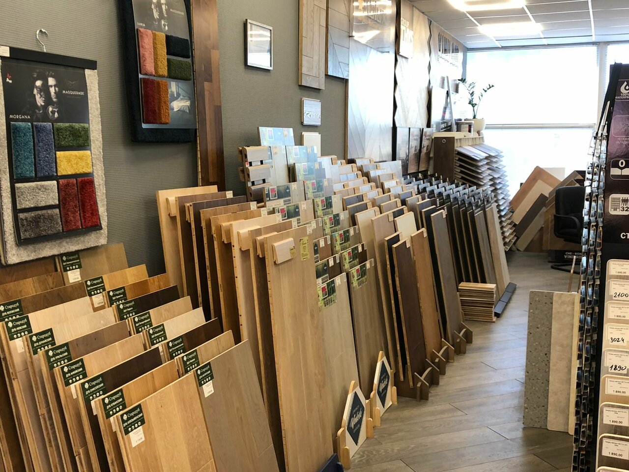 - Большой ассортимент напольных покрытий