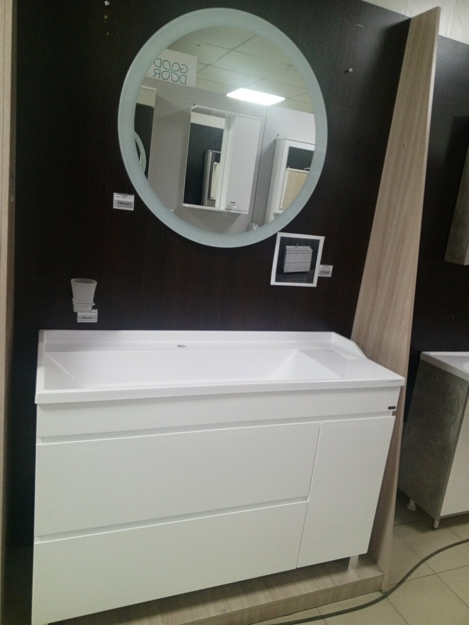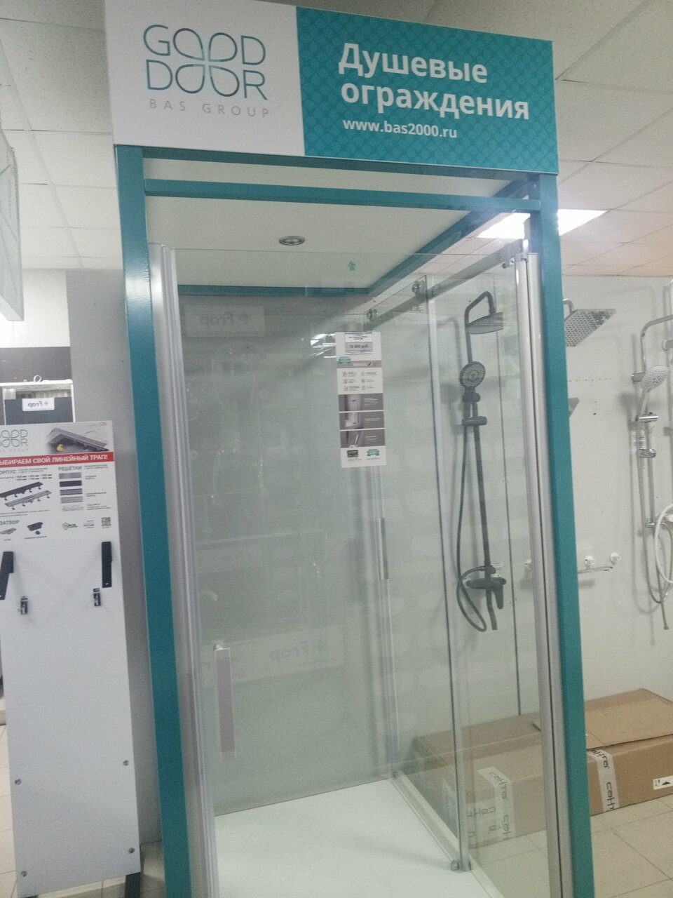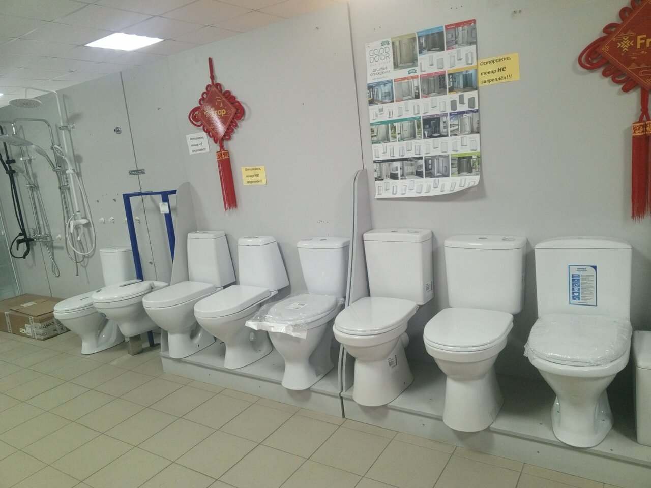 - Большой ассортимент плитки, дверей, сантехники