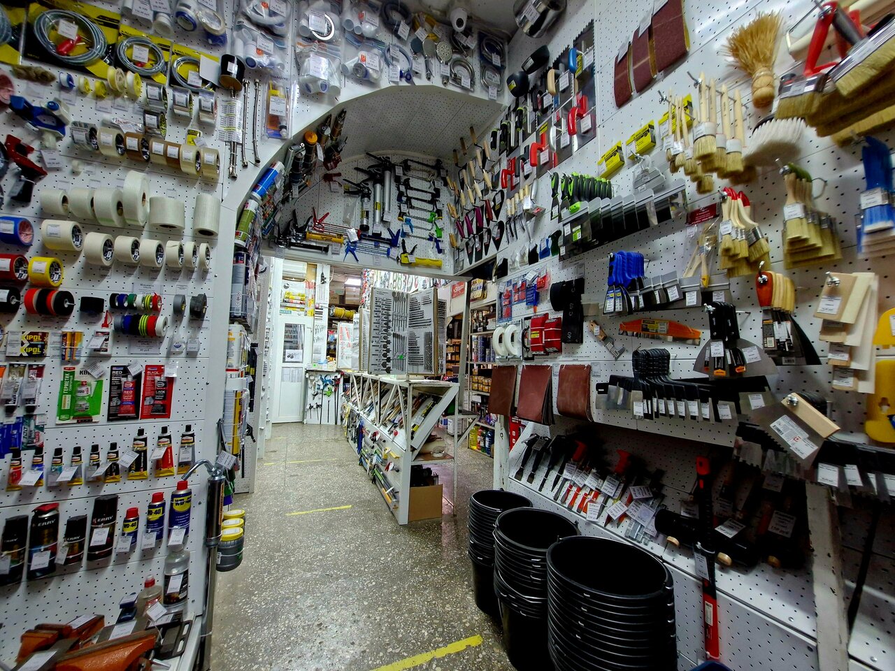 Выбор краски и сопутствующих инструментов не хуже чем в специализированных супермаркетах. Поэтому тесно. Работают несколько консультантов, поэтому много времени там не проводишь.