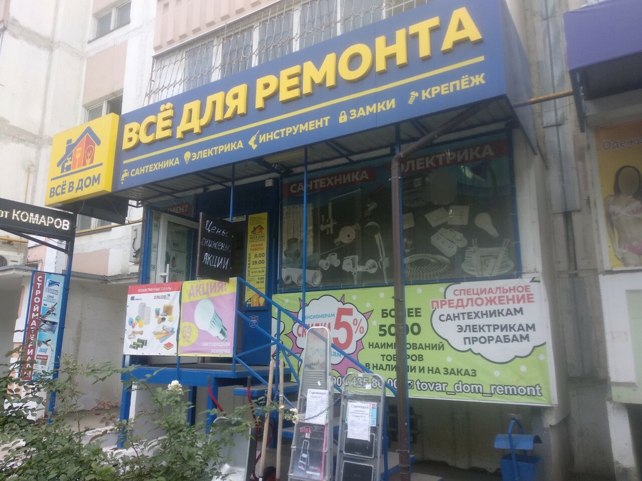 «Все для дома и ремонта» — строительный магазин в Ростове-на-Дону, предлагающий материалы, инструменты и товары для строительства, отделки и ремонта. Расположен по адресу: Днепровский переулок, 116В. Режим работы: пн–пт 08:00–19:00, сб–вс 09:00–18:00. Контактный телефон: +7 (909) 435-80-00.