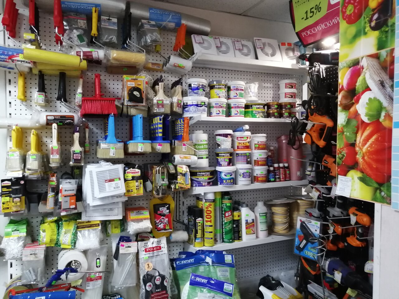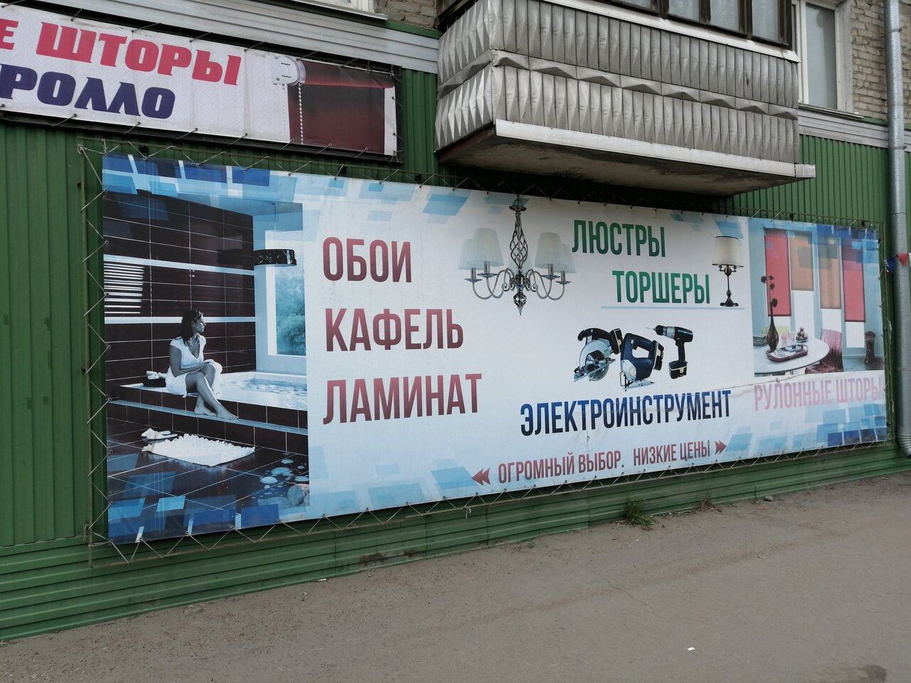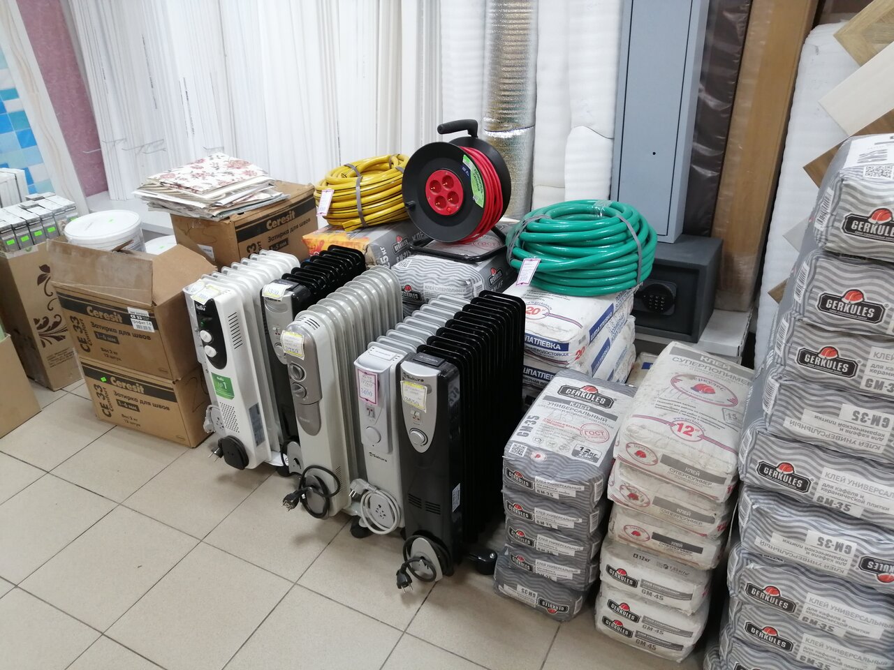 - Большой выбор строительных материалов (обои, кафель, шторы, люстры, смеси)