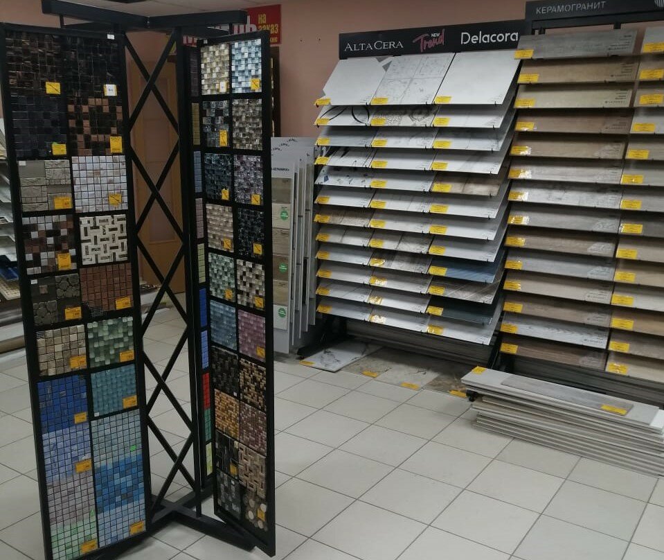 Основные категории товаров: — Плитка (для ванной, кухни, пола, стен, бассейна, мозаичная, декоративная и др.) — Сантехника — Лакокрасочные материалы — Стеновые панели