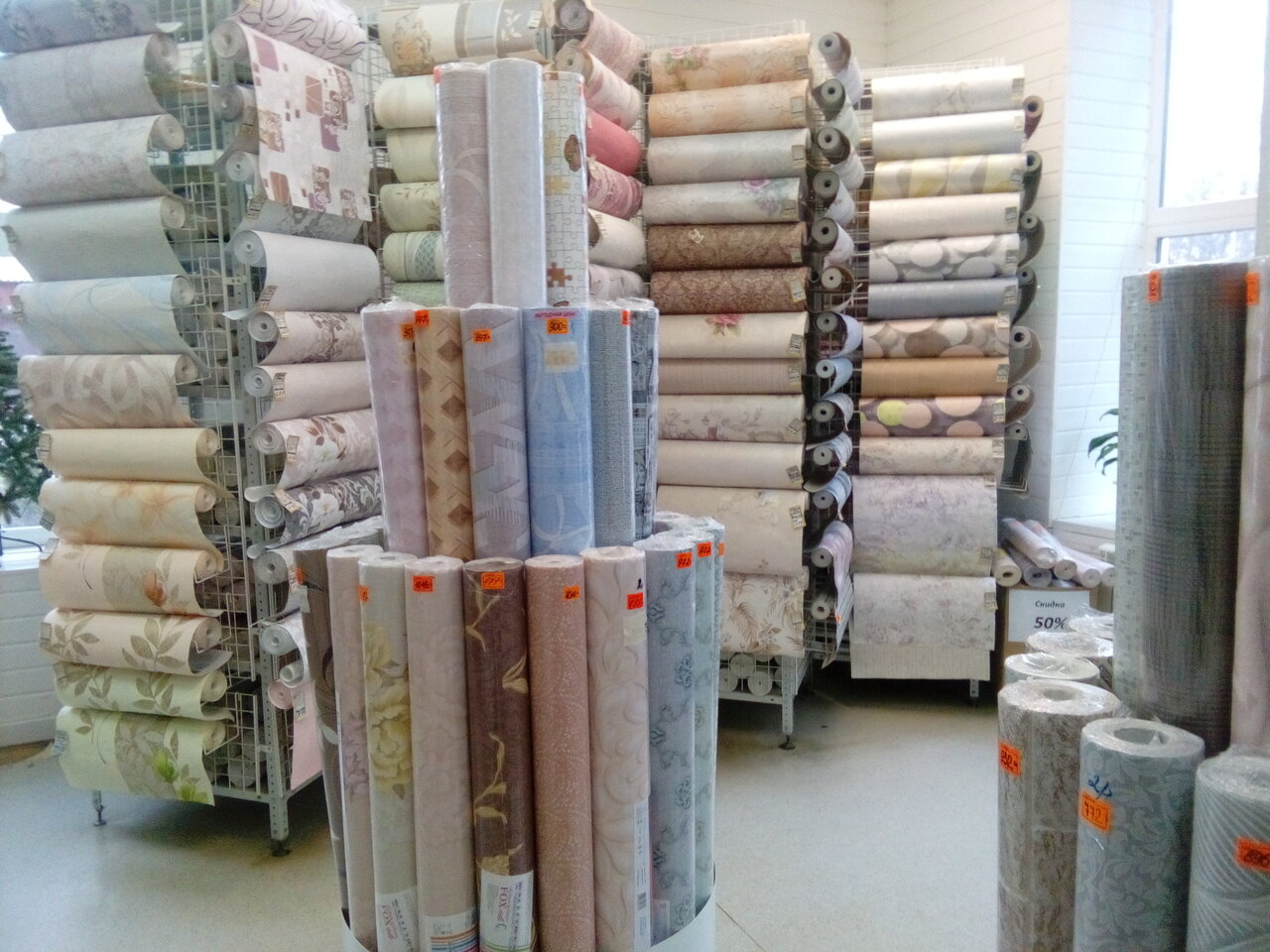 Выбор обоев не очень большой. Есть канцелярский отдел, где покупаем школьные принадлежности, открытки.
