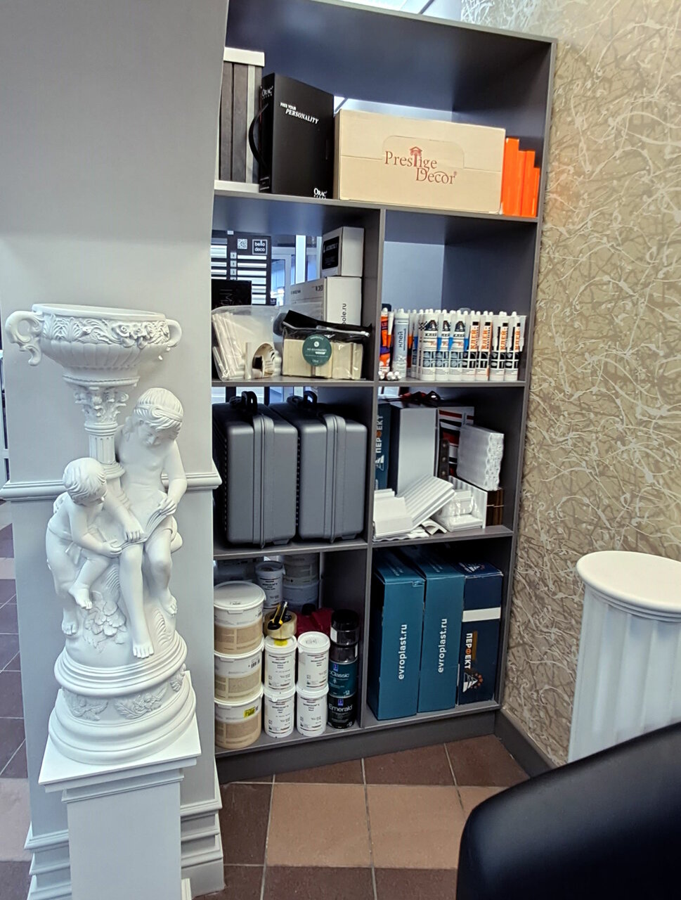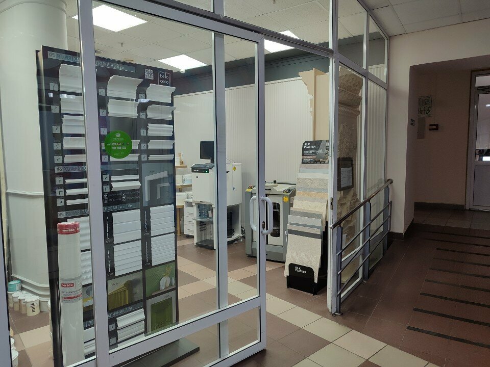- Большой ассортимент отделочных материалов (лепной декор, обои, краска)