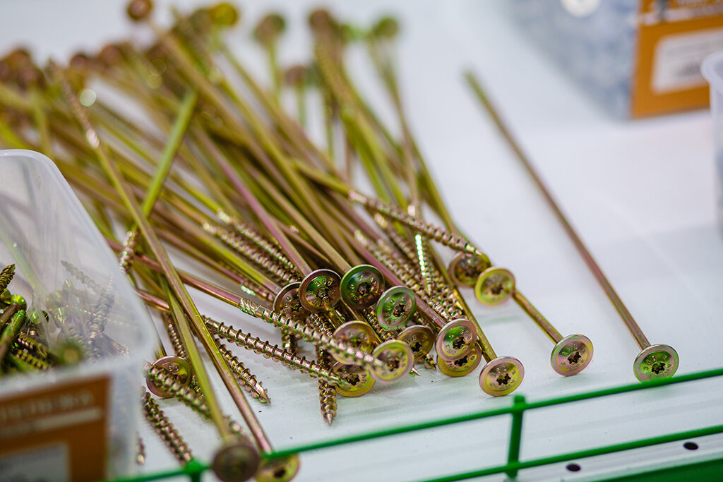 - Большой ассортимент крепежа (саморезы, гвозди, болты, гайки, уголки и т. д.)