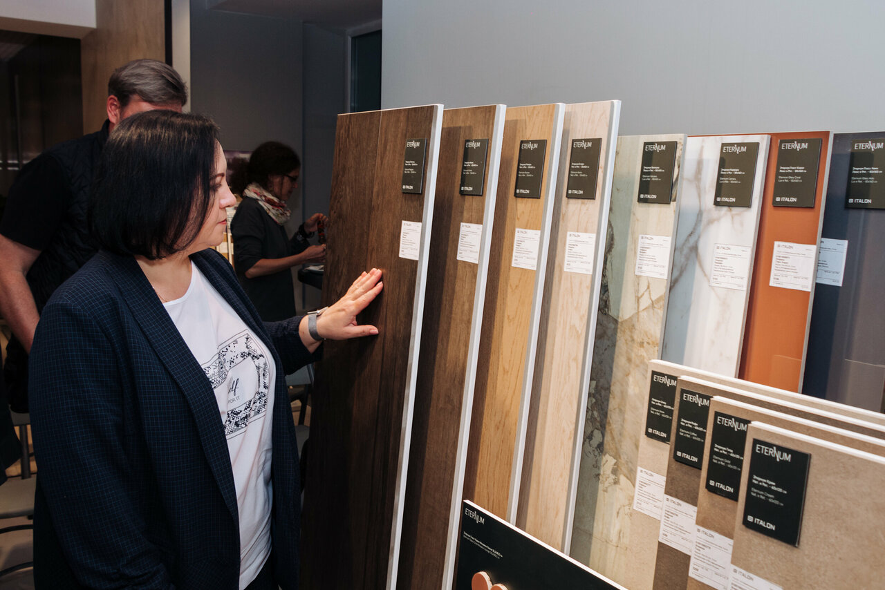 Большое разнообразие оттенков и фактур керамогранита живьем на стендах и в небольших интерьерных фрагментах. На экспозиции также представлены раковины и душевые поддоны из керамогранита, что особо ценно, что можно рассмотреть нюансы. Рекомендую салон. Несколько раз покупали плитку Италон.