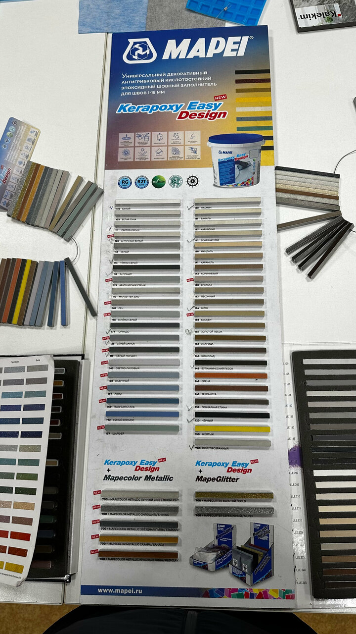 - Большой выбор затирок, эпоксидных и цементных смесей