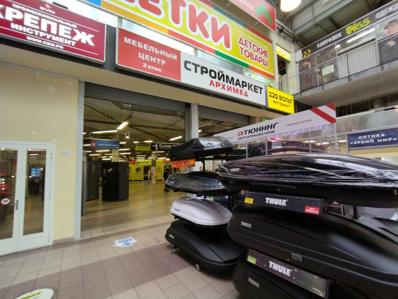 Достаточно большое количество магазинов строительной тематики. Метизы — хороший ассортимент, неприлично высокие цены. Двери — несколько фабрик. Инструмент — 220 вольт. Отделочные материалы, освещение. Отдельно отмечу магазин, где продаются верёвки, хороший ассортимент. На 2-ом этаже — большое количество мебельных фирм.