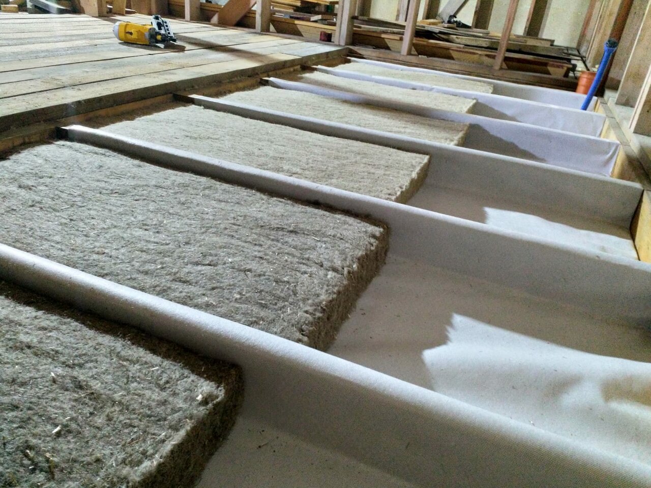 Использовал утеплитель Лен, когда строил первый дом еще 12 лет назад. Сейчас строю дом для родителей и выбрал снова Лен. Понравился тем, что имеет приятный запах и позволяет работать с ним в шортах и футболке- можно опираться коленями и локтями на маты- ничего не чешется. Не смотря на то, что материал мягкий- размер его точный и ложится между лагами (58 см) достаточно плотно. Однако при желании уложить с большей плотностью- можно использовать расстояние между лагами- 57 см. Сразу же прибежала кошка и разлеглась на матах — материал ей очень понравился.)) Рекомендую всем, кто также как я щепетильно подходит к своему здоровью.