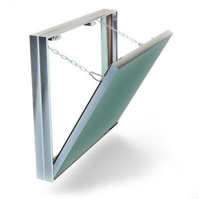 Модель «Гефест» - потайной ревизионный люк с повышенной огнестойкостью (противопожарный сертификат EI-60), служит для доступа к различным коммуникациям. Люк оснащен распашной дверцей из усиленного алюминиевого профиля. Дверь заполнена огнестойким гип