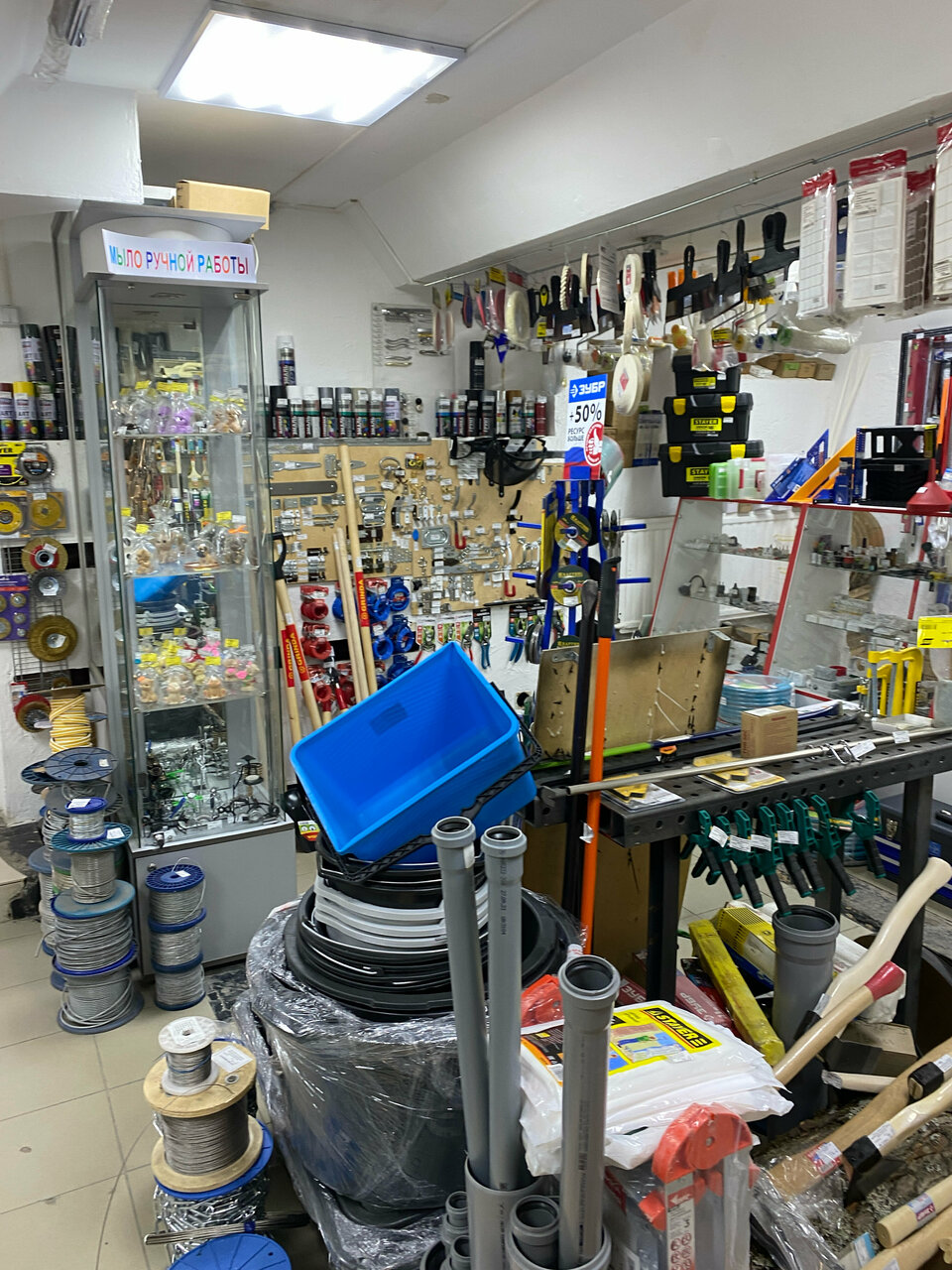 Небольшой подвальный магазинчик хозяйственных товаров первой необходимости. Есть отдел метизами, крепежом и мелким инструментом. Из за ограниченной площади, ограниченный ассортимент, но по стандартным позициям вполне удовлетворяет.